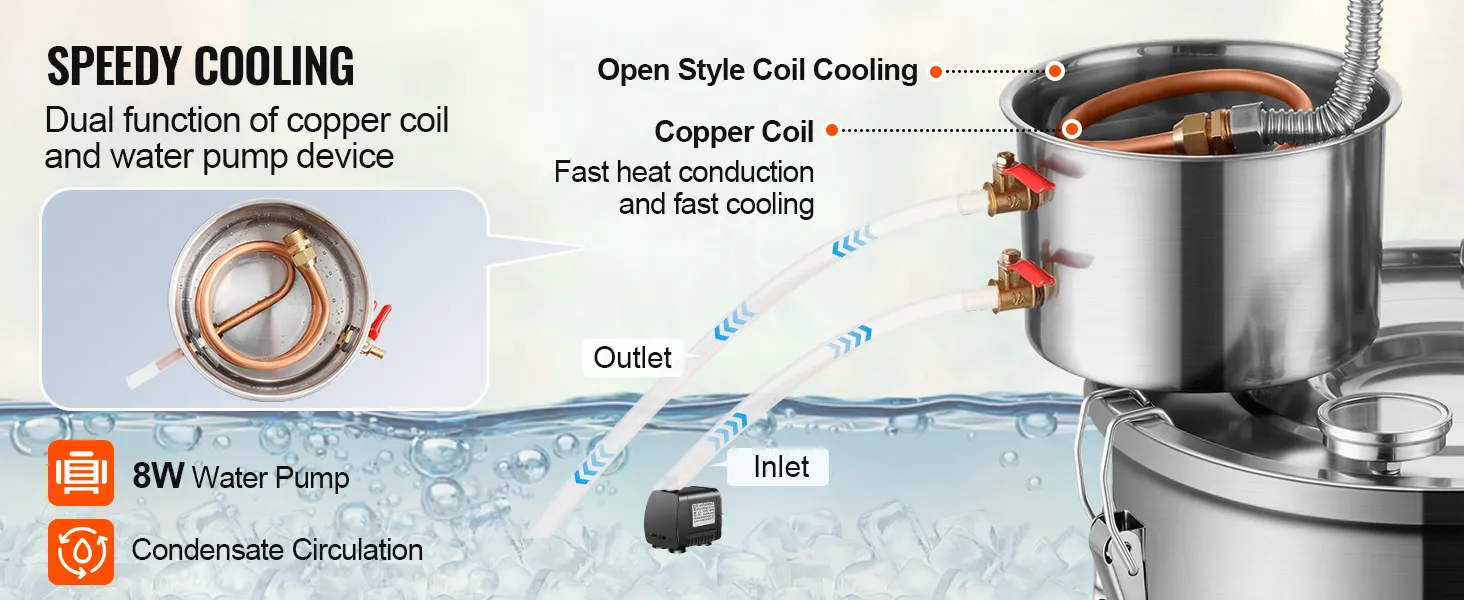 Snelle en efficiënte koeling: de gladde en kreukvrije binnenkant van de tubes voorkomt resten van gedestilleerde alcohol, water en essentiële oliën, voorkomt bacteriegroei en zorgt ervoor dat er geen nasmaak ontstaat. Een waterpomp vergemakkelijkt de koelwatercirculatie, waarbij inlaat- en uitlaatkleppen de stroomsnelheden regelen voor een grondige en efficiënte koeling.