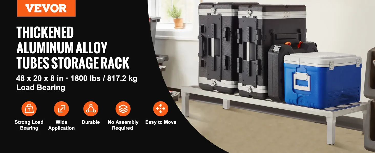 The VEVOR welded aluminum storage rack holds up to 1800 lbs / 817.2 kg and is rust-resistant. Its versatile design offers tool-free assembly, portability, and multiple size options. Ideal for efficient and durable storage.