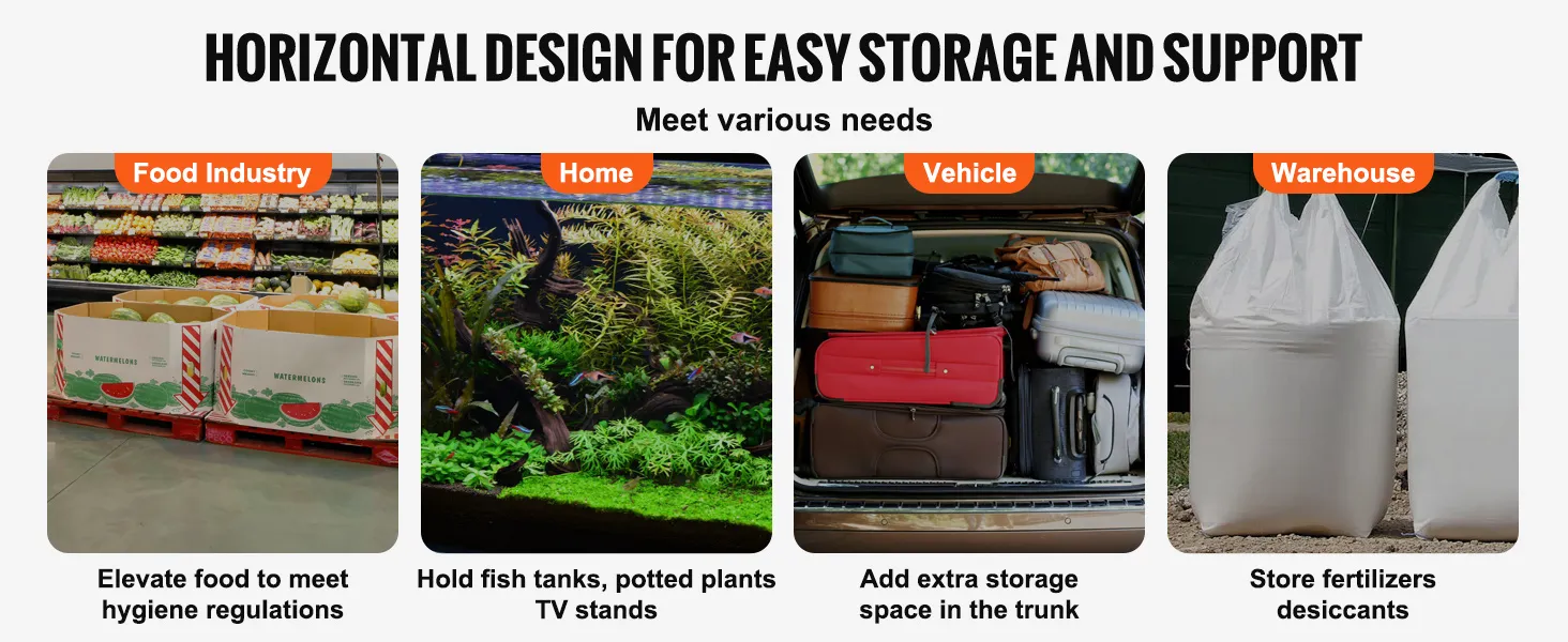 Suitable for Various Settings: Ideal for any environment, this aluminum storage rack effortlessly solves your storage needs. It's versatile enough for kitchens, supermarkets, warehouses, garages, and even vehicles. It can store food, heavy equipment, aquariums, potted plants, TVs, fertilizers, and expand trunk storage space.