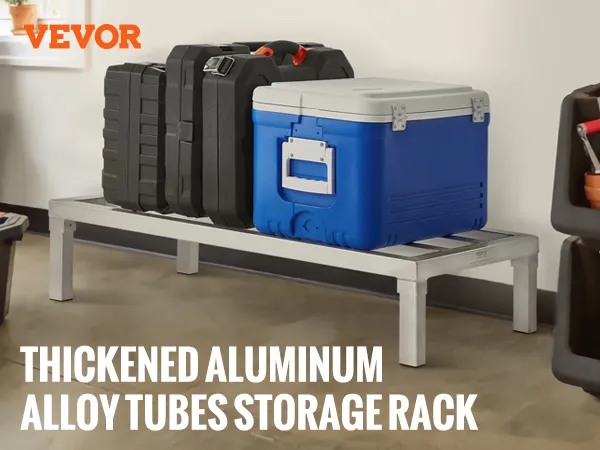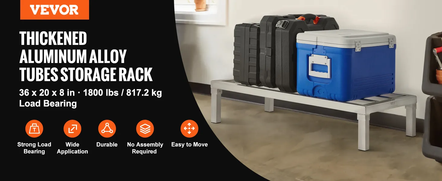 The VEVOR welded aluminum storage rack holds up to 1800 lbs / 817.2 kg and is rust-resistant. Its versatile design offers tool-free assembly, portability, and multiple size options. Ideal for efficient and durable storage.