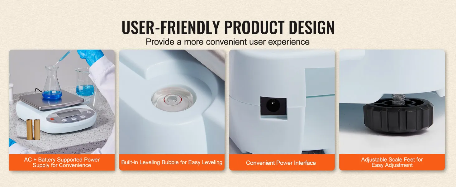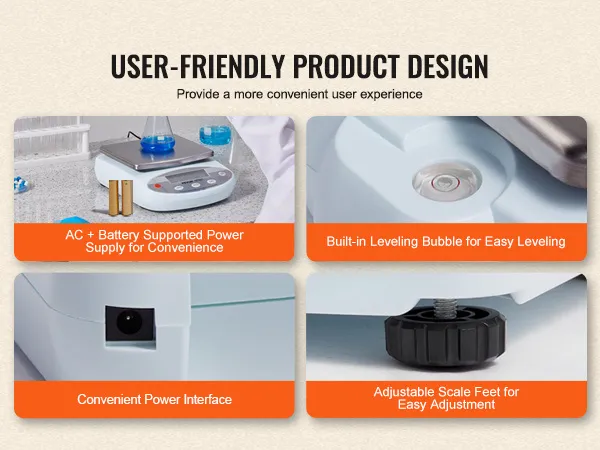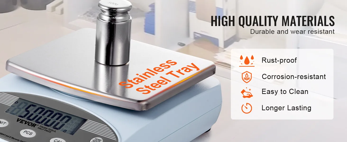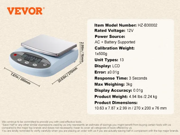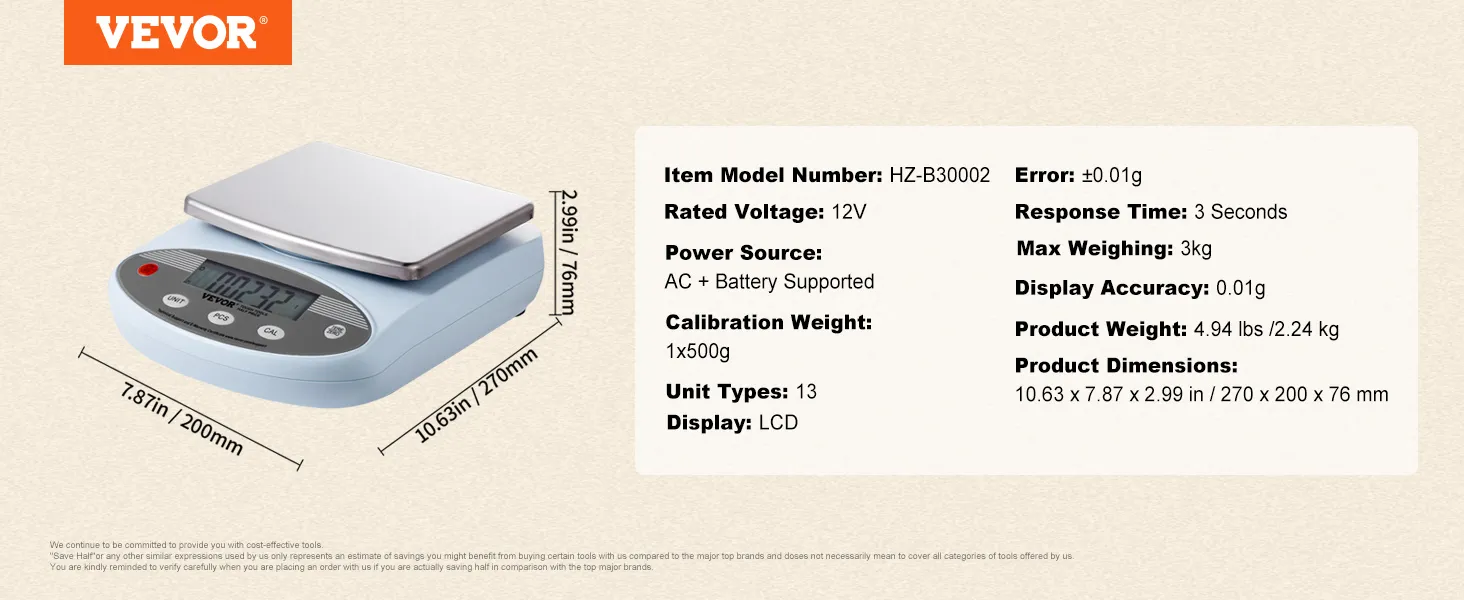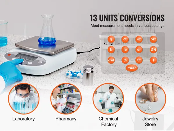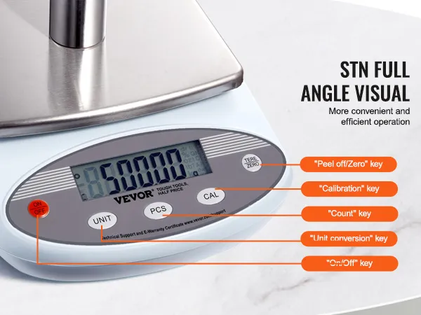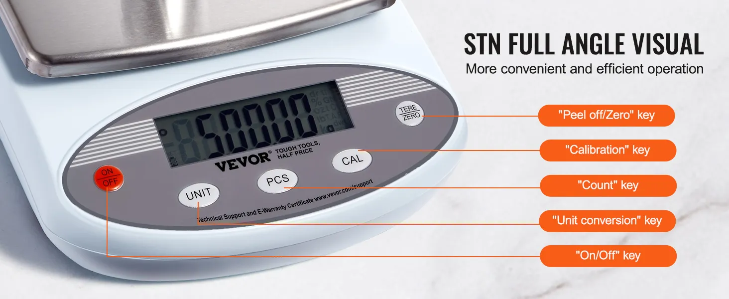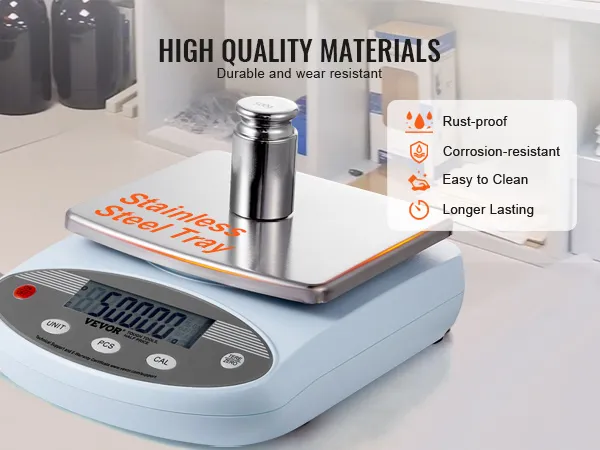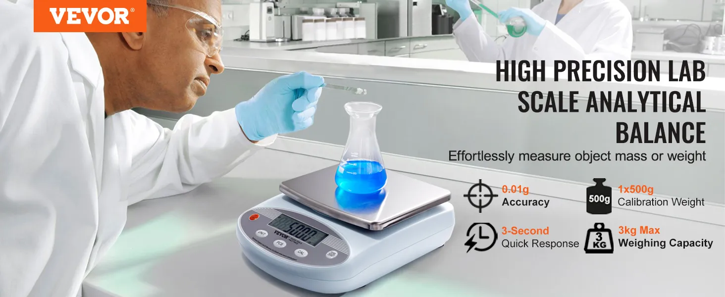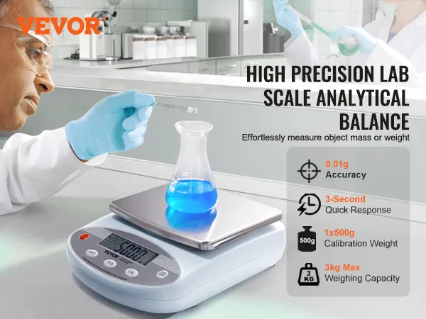 De VEVOR laboratoriumanalyseweegschaal beschikt over uiterst nauwkeurige sensoren met een snelle responstijd van 3 seconden en maakt snel en nauwkeurig wegen mogelijk met een nauwkeurigheid van 0,01 g en een maximale weegcapaciteit van 3000 g.