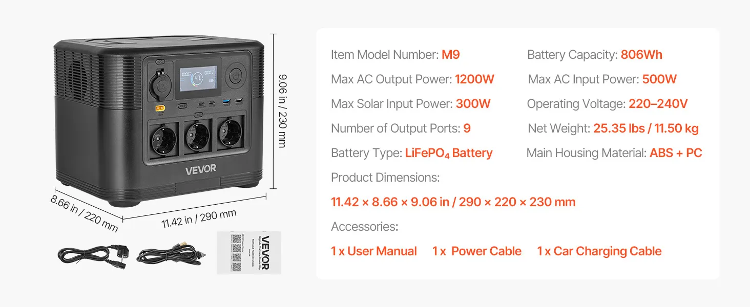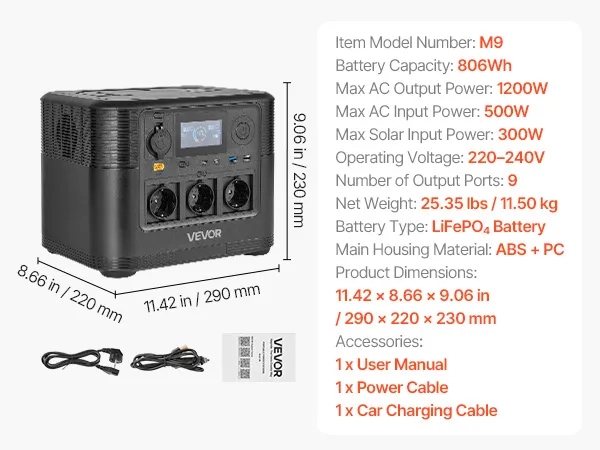 VEVOR draagbare stroomgenerator, 1200W zonnegenerator, 806Wh LiFePO4-accu met 9 uitgangen voor noodgevallen thuis, kamperen en camperreizen (zonnepaneel NIET inbegrepen)