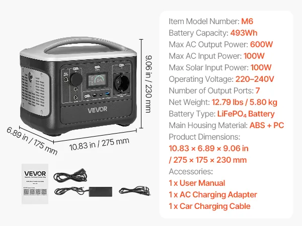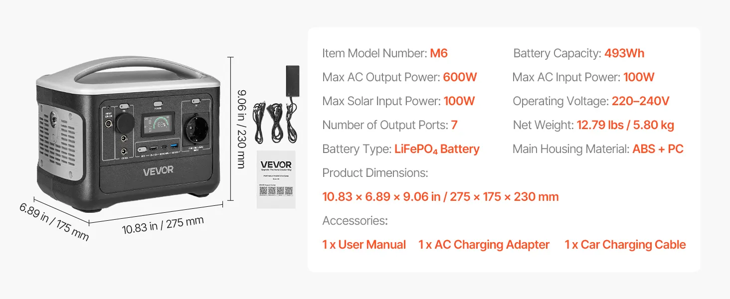 VEVOR draagbare stroomgenerator, 600W zonnegenerator, 493Wh LiFePO4-accu met 7 uitgangen, geschikt voor noodgevallen thuis, kamperen en camperreizen (zonnepaneel NIET inbegrepen)