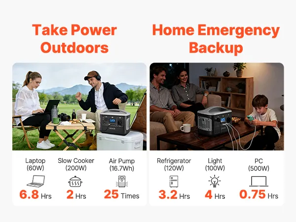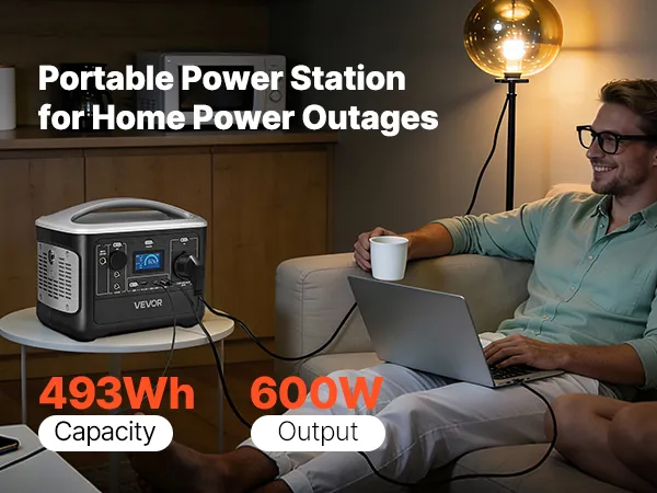 • Betrouwbare mobiele stroomvoorziening: Geniet van een stabiele stroomvoorziening thuis of tijdens uw outdooravonturen met dit 600W powerstation (493Wh). Het kan tegelijkertijd mobiele telefoons, autokoelkasten, luidsprekers en camera's van stroom voorzien gedurende ongeveer 6 uur tijdens het kamperen.
