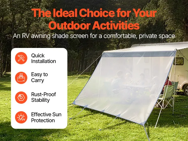 Dit zonnescherm voor camperluifels is gemaakt van duurzaam polyesterweefsel en verstevigd met dubbele naden. Het biedt betrouwbare sterkte en flexibiliteit voor langdurig gebruik buitenshuis.