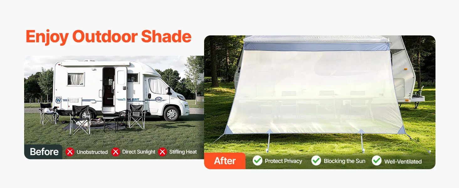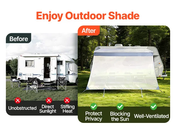 Effectieve zonbescherming: Het zonneschermnet voor camperluifels blokkeert fel zonlicht en vermindert verblinding, terwijl het tegelijkertijd zorgt voor goede luchtcirculatie. Zo blijft de schaduwplek aangenaam koel en comfortabel – ideaal om te ontspannen en buiten te kamperen.