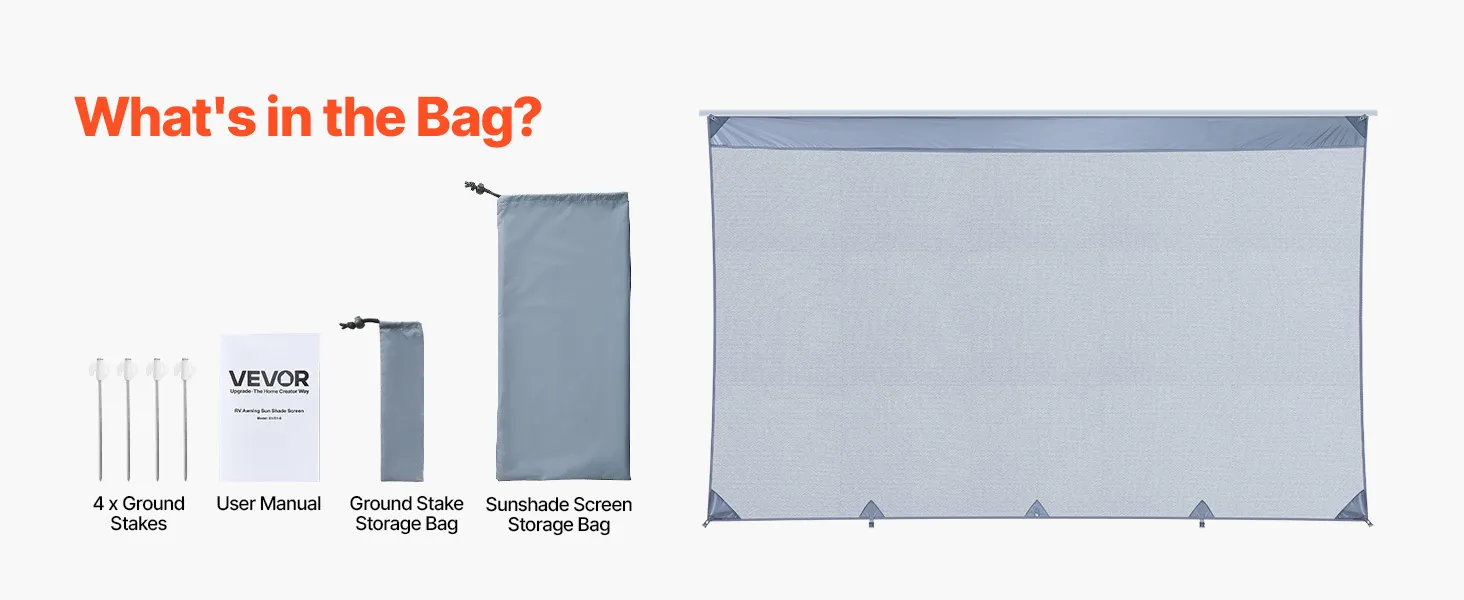 Inclusief zonnescherm voor campers, 4 grondpennen, een handleiding, een opbergtas voor de grondpennen en een aparte opbergtas voor het zonnescherm, waardoor opbergen en vervoeren eenvoudig is.