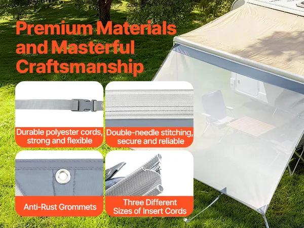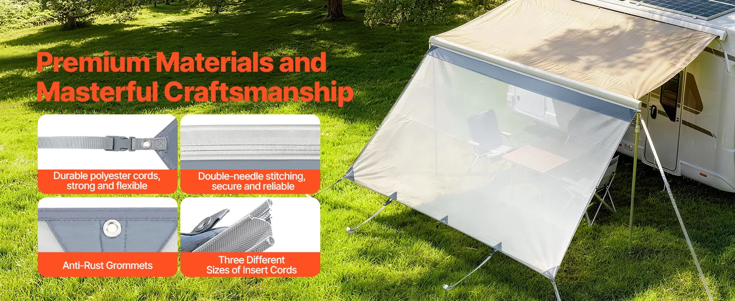 Duurzaam en betrouwbaar: Dankzij het polyesterweefsel met hoge dichtheid, de dubbelgestikte naden en de vier versterkte hoeken is dit voorpaneel voor camperluifels bijzonder scheurvast en vormvast, ontworpen voor langdurig gebruik. Vier grondankers voor een stabiele basis zijn inbegrepen.