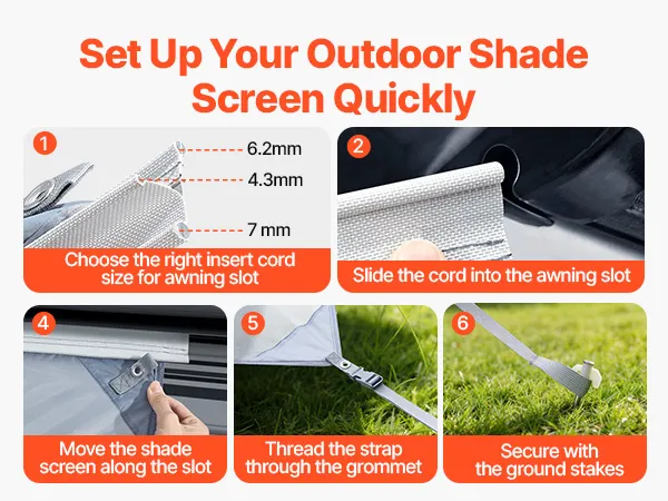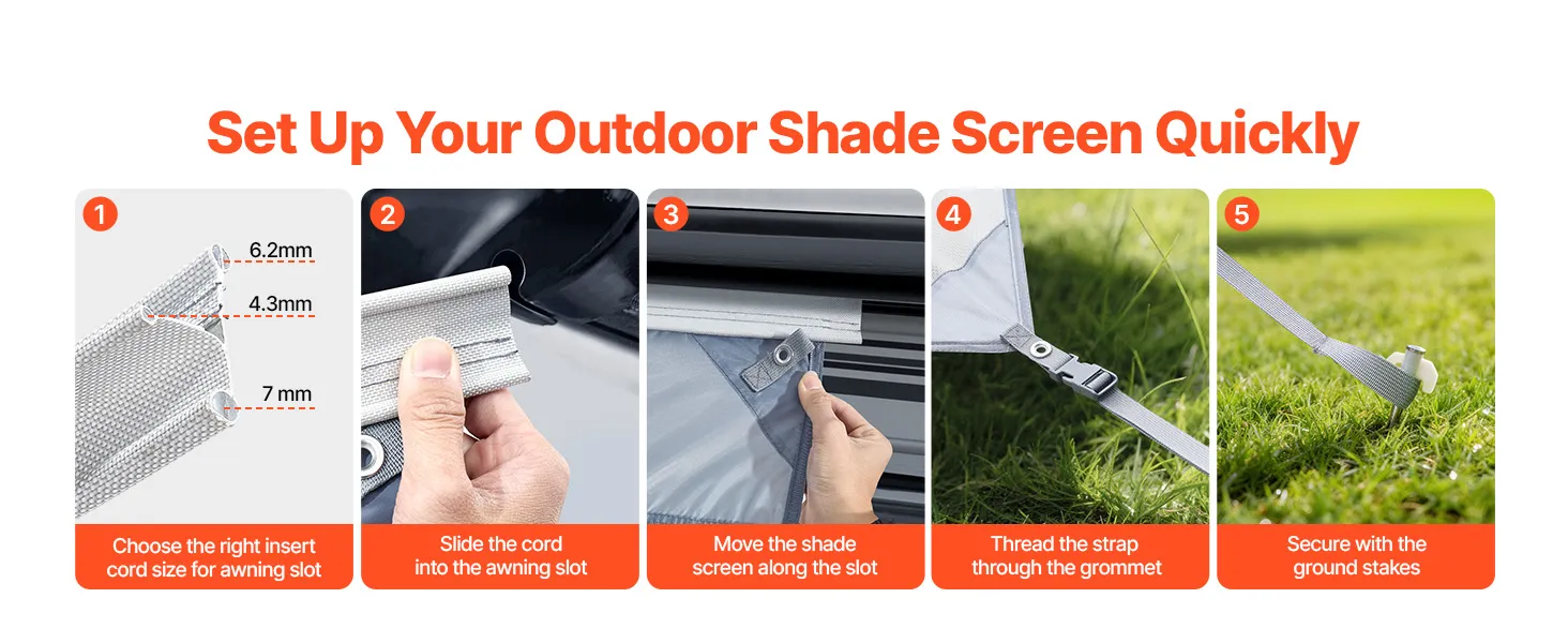 Snelle montage en stevige bevestiging: Drie bevestigingskoorden met verschillende diameters (4,3 mm / 6,2 mm / 7 mm) passen op diverse zonneschermrails, waardoor een nauwsluitende pasvorm, eenvoudige installatie en stabiele ondersteuning gegarandeerd zijn. Inclusief opbergtassen voor ruimtebesparende opslag en gemakkelijk transport.