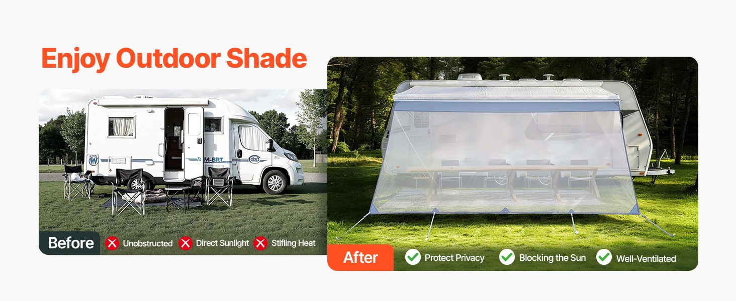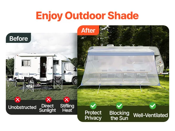 Effectieve zonbescherming: Het zonneschermnet voor camperluifels blokkeert fel zonlicht en vermindert verblinding, terwijl het tegelijkertijd zorgt voor goede luchtcirculatie. Zo blijft de schaduwplek aangenaam koel en comfortabel – ideaal om te ontspannen en buiten te kamperen.