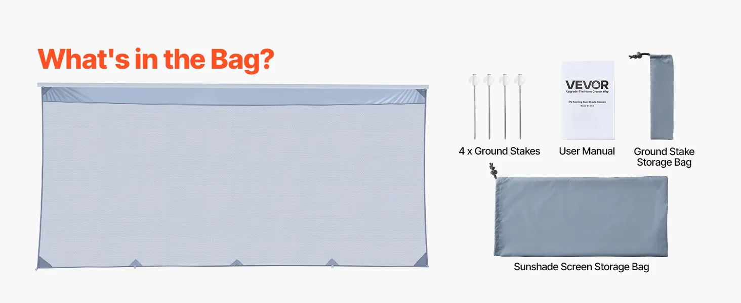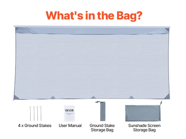 Inclusief zonnescherm voor campers, 4 grondpennen, een handleiding, een opbergtas voor de grondpennen en een aparte opbergtas voor het zonnescherm, waardoor opbergen en vervoeren eenvoudig is.