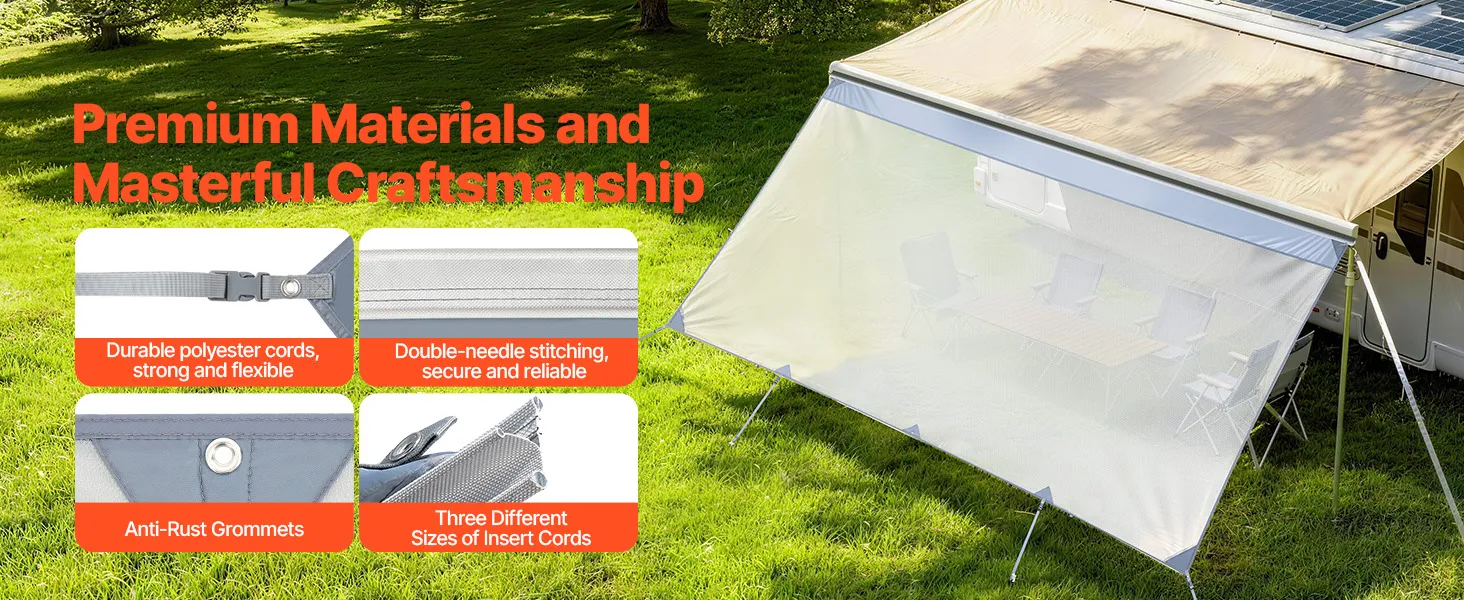 Dit zonnescherm voor camperluifels is gemaakt van duurzaam polyesterweefsel en verstevigd met dubbele naden. Het biedt betrouwbare sterkte en flexibiliteit voor langdurig gebruik buitenshuis.