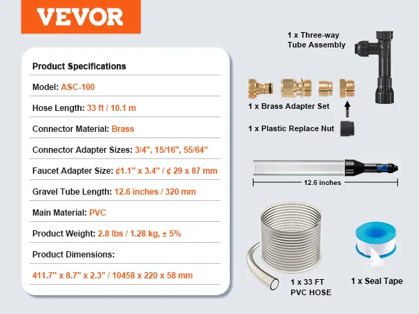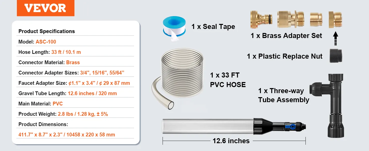 VEVOR Aquarium Vacuum Gravel Cleaner, 33 ft PVC Hose Fish Tank Vacuum Gravel Cleaner, Siphon Fish Tank Cleaner Vacuum, 3 Types of Brass Adapters, for Fish Tank Cleaning Gravel & Sand