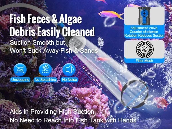 Quietly Clean Fish Waste and Gravel: When draining, extend the 12.6 inch gravel pipe into the aquarium. The long pipe allows you to clean the bottom without touching dirty water, making cleaning easy even in tall aquariums. With an internal filter net, fine pores prevent sand from entering; the large diameter of φ0.8" / φ51 mm helps improve the efficiency of sucking up fish waste and other viscous substances. The entire process is noiseless, ensuring the fish are not disturbed.