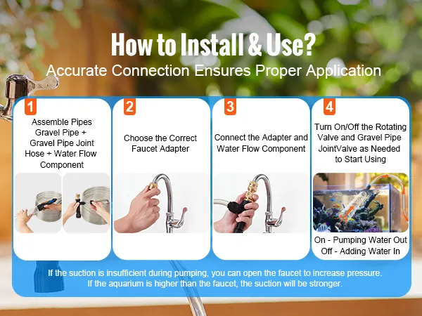 Easy to Assemble and Use: When changing water, after connecting the hose to the water flow component and gravel pipe, first immerse the gravel pipe into the aquarium water and keep its valve closed, then keep the valve of the water flow component open and turn on the faucet, finally open the valve of the gravel pipe, and the dirty water will be sucked into the hose and drained away.