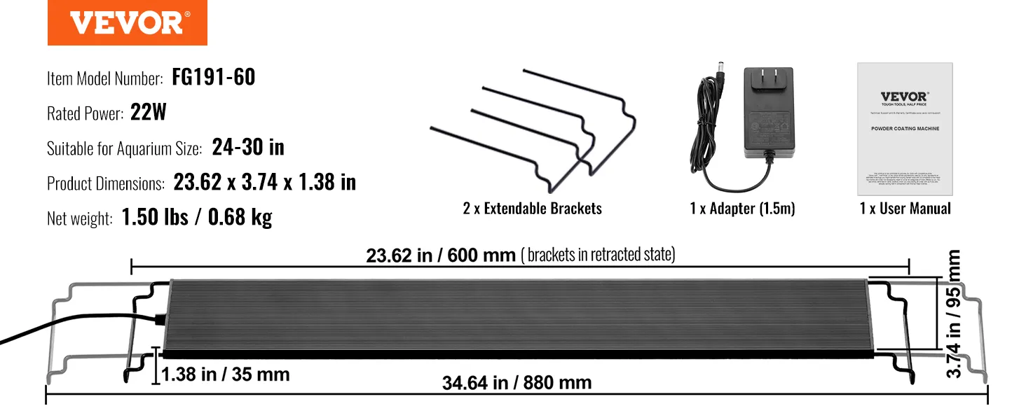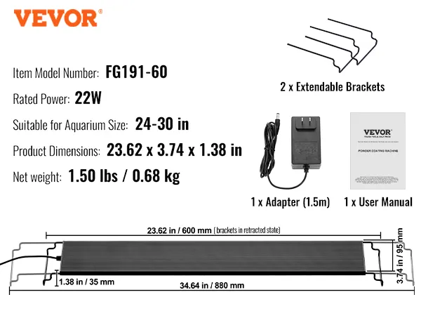 Breed toepassingsgebied: de VEVOR LED-aquariumlampen zijn ontworpen voor aquaria van 24 tot 30 inch (61-76 cm) en hebben 2 uitschuifbare beugels met een maximale verlenging van 5,5 inch (13,97 cm) aan één kant en 11 inch (27,94 cm). ) aan beide kanten. Hierdoor kunnen ze eenvoudig worden bevestigd aan de meeste glazen of acrylaquaria, met of zonder transparant deksel, met of zonder rand. Geschikt voor zowel beginners als ervaren aquarianen.
