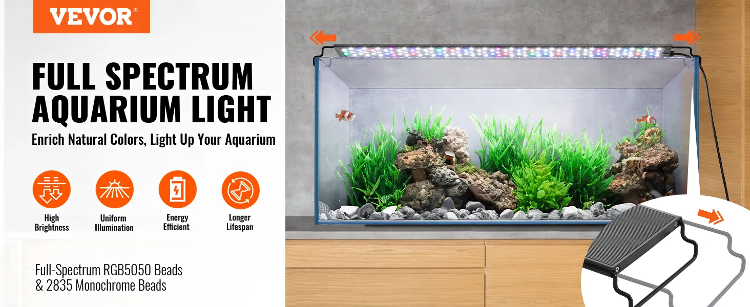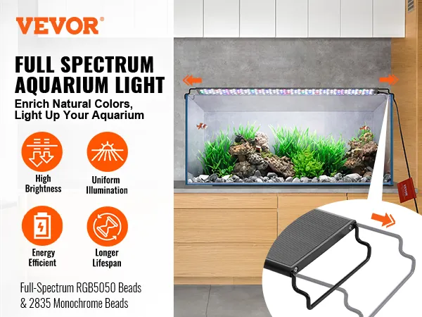 Verbeterde, hoogwaardige LED-lampen: de krachtige en heldere aquariumlampen met volledig spectrum van VEVOR zijn uitgerust met hoogwaardige monochrome RGB5050- en 2835-lampen, die zorgen voor een uniforme en stabiele verlichting zonder flikkering. Volledige spectrumverlichting biedt optimale verlichting voor vissen en verbetert uw visuele comfort met energiezuinige en langdurige prestaties tot wel 30.000 uur.