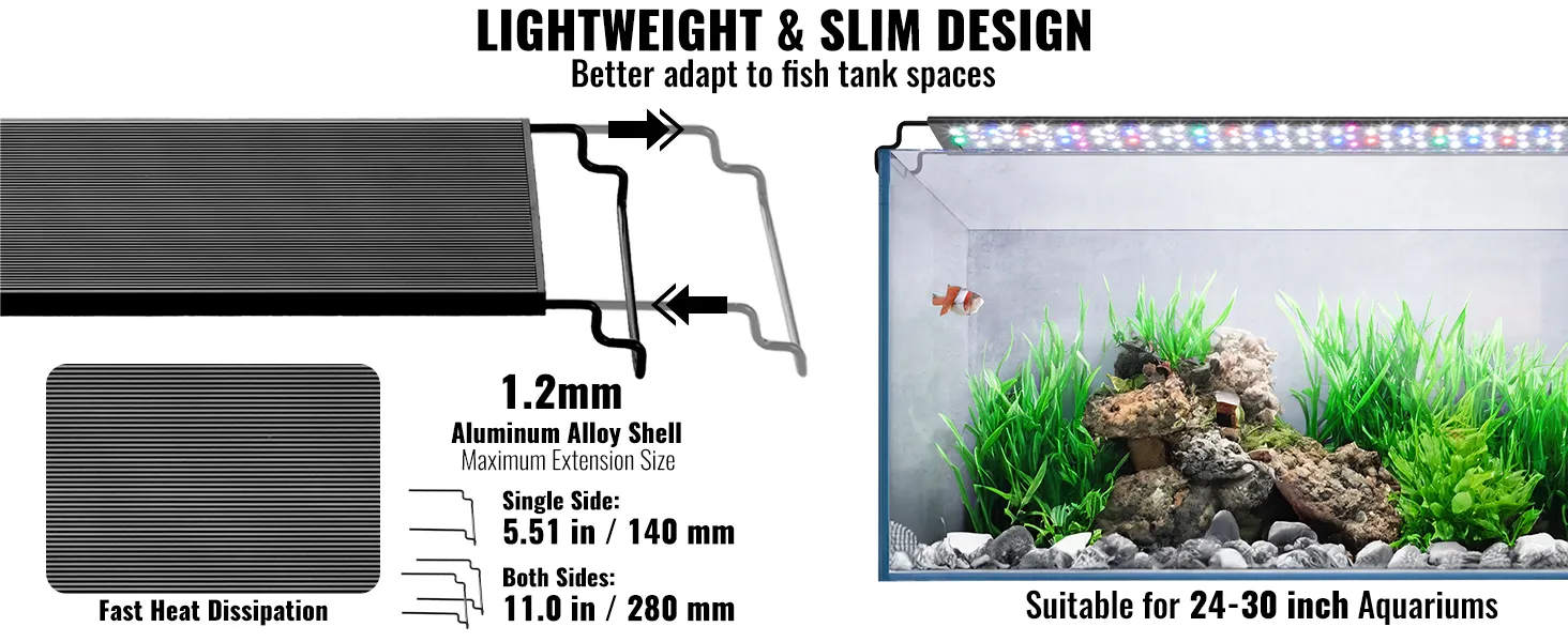 Past moeiteloos in uw aquarium zonder veel ruimte in beslag te nemen. Onze aquariumlamp is gemaakt van een 1,2 mm dikke aluminiumlegering, wat zorgt voor een efficiënte warmteafvoer. Hij is geschikt voor tanks van 61 tot 76 cm en past naadloos in uw aquarium.