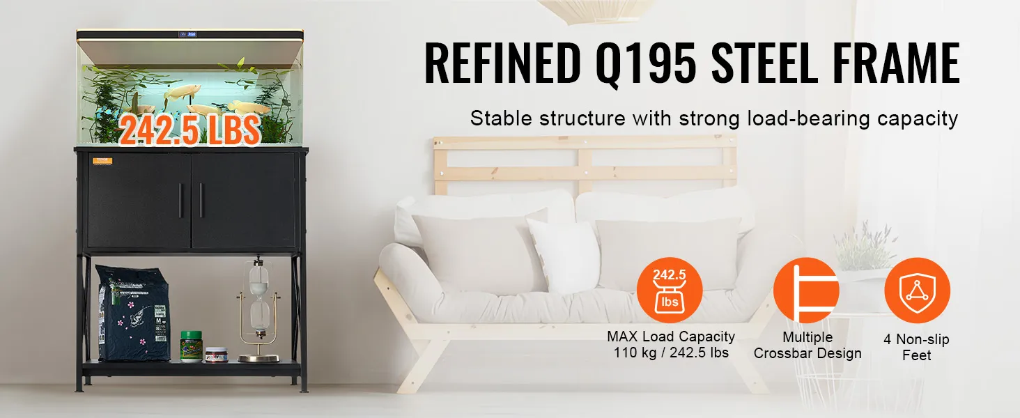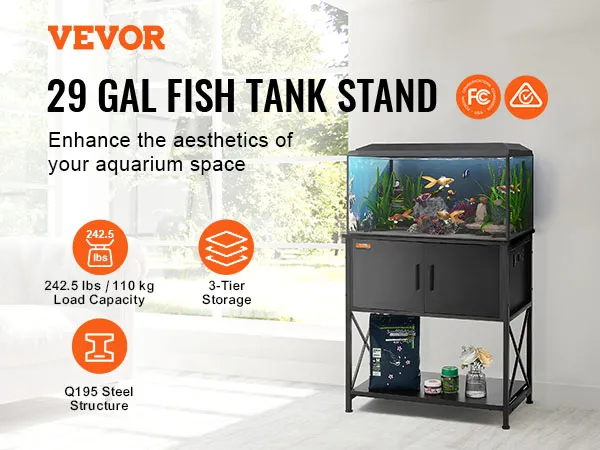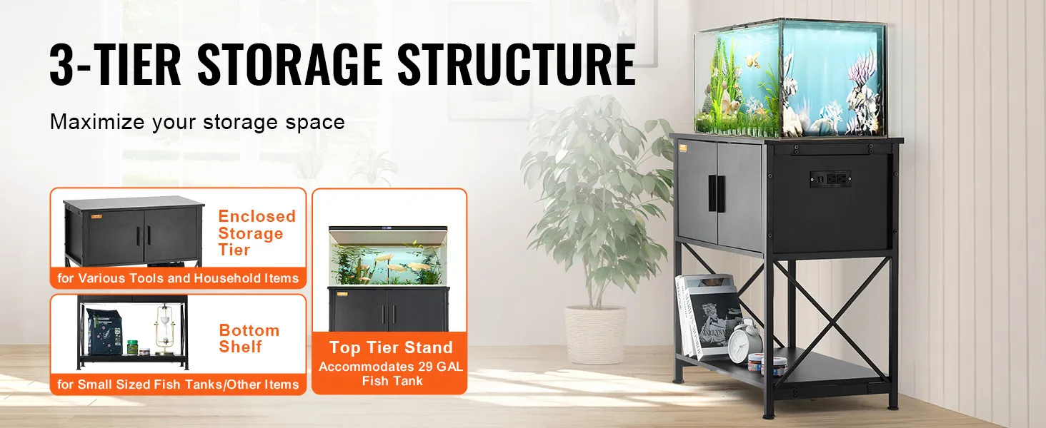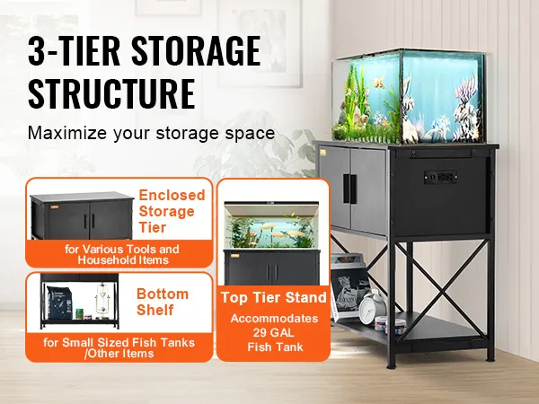 Onze huishoudelijke aquariumstandaard is geschikt voor een aquarium van maximaal 29 gallon. De standaard is gemaakt van Q195 stalen frame en kan maximaal 110 kg dragen. Het drielaagse ontwerp met meerdere opslagniveaus en een geïntegreerd stopcontact bieden voldoende opbergruimte voor uw gemak.