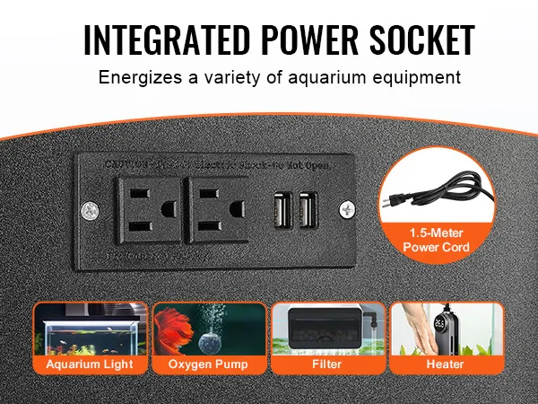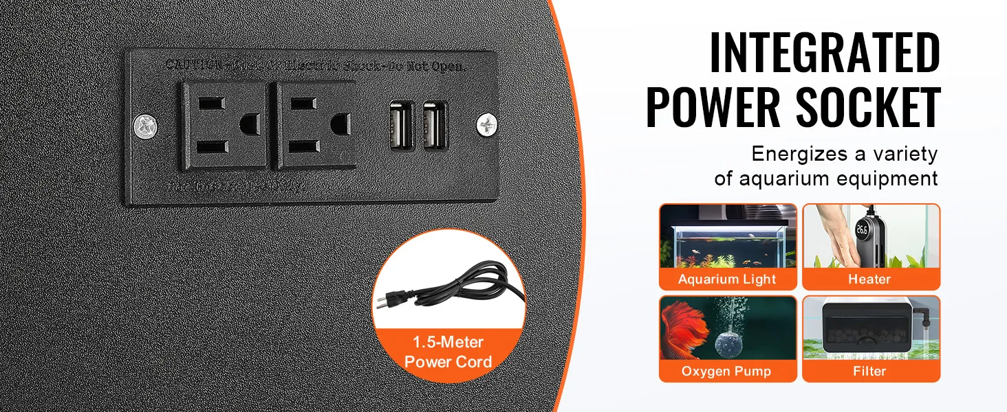 Onze viskraam heeft een ingebouwd stopcontact met 2 AC- en 2 USB-poorten. Het maakt de elektrische bediening van verschillende aquariumapparaten mogelijk, zoals aquariumverlichting, verwarmingen, luchtpompen en filters.