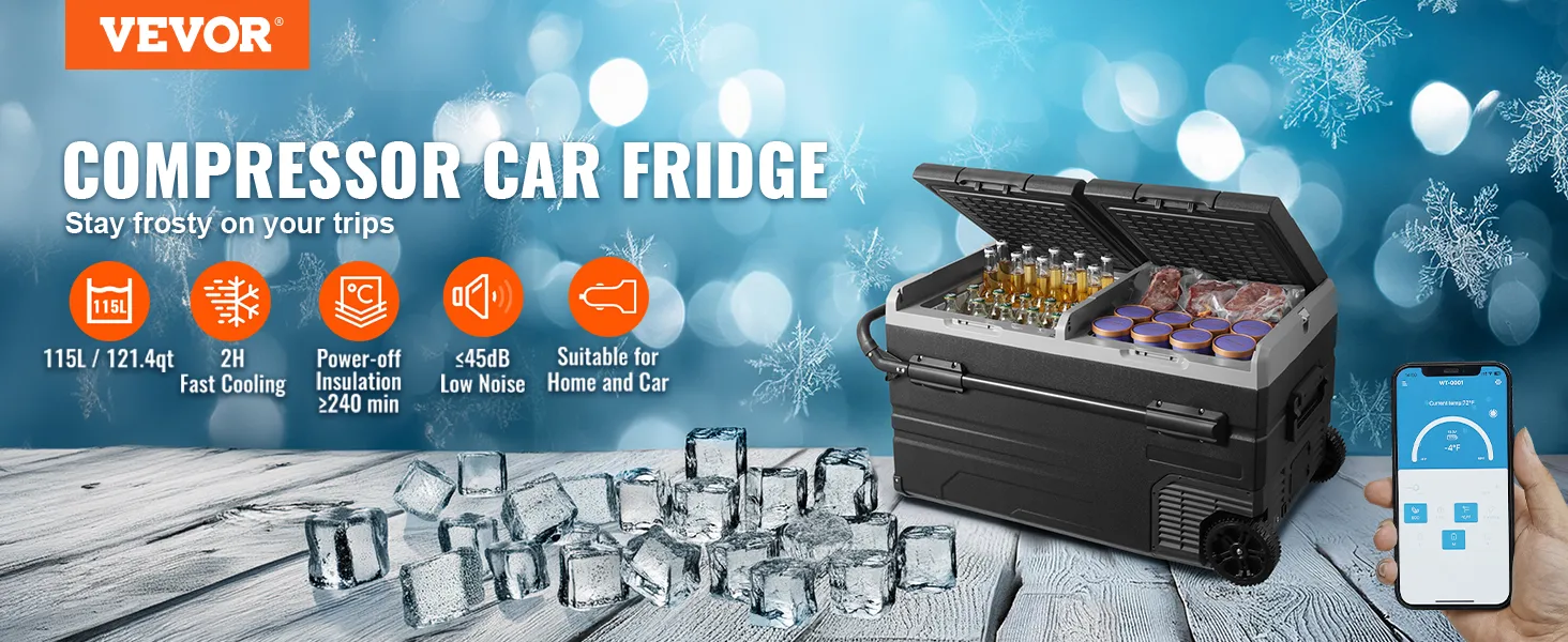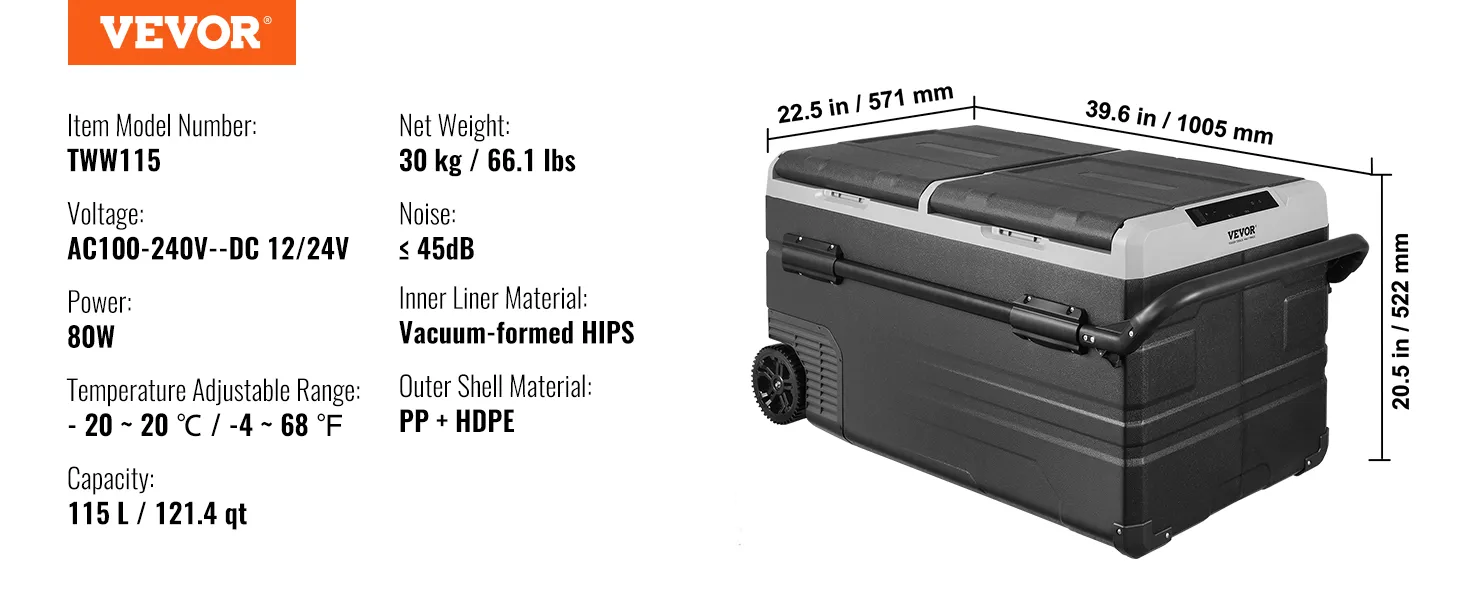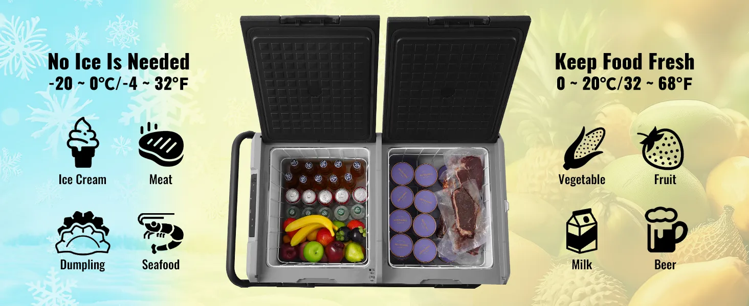 Large Capacity: The portable refrigerator freezer has a dual compartment capacity of 115 L. This robust RV fridge can hold 114 cans of 330ml cola or 59 bottles of 550ml water or 32 bottles of 750ml red wine, accommodating seafood, snacks, meats, and beverages, meeting the needs of short trips such as travel, boating, and camping.