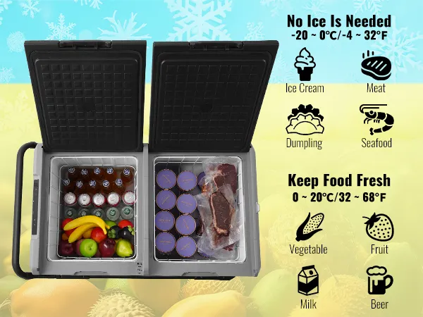 Adjustable temperature from -20 ~ 20 ℃ / -4 ~ 68 ℉, suitable for refrigerating beer, beverages, fruits, ice cream, various meats, and more.