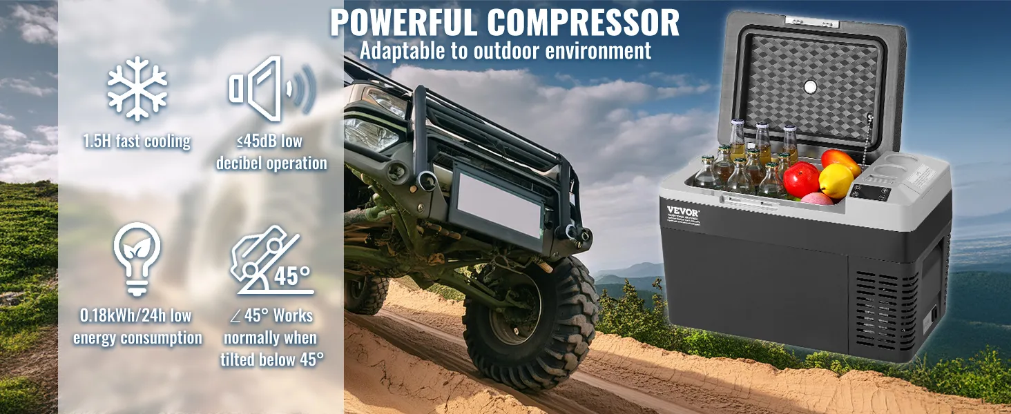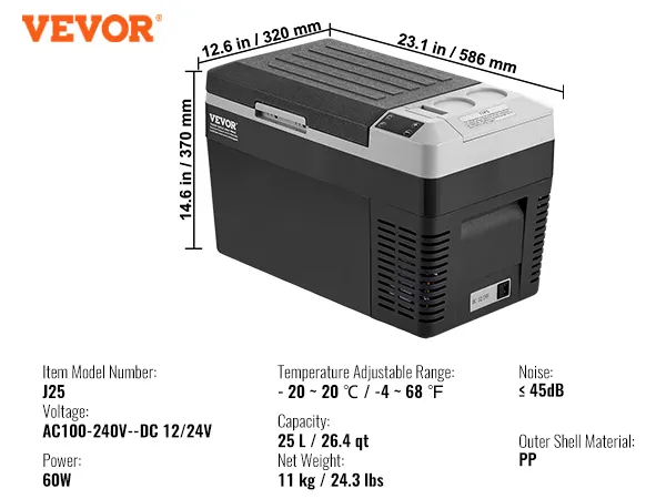 25 L / 26.4 qt car refrigerator with upgraded compressor for rapid cooling in 1.5H, capable of storing at both high and low temperatures, maintaining excellent operation between 16 ~ 38 ℃ / 60.8 ~ 100.4 ℉.