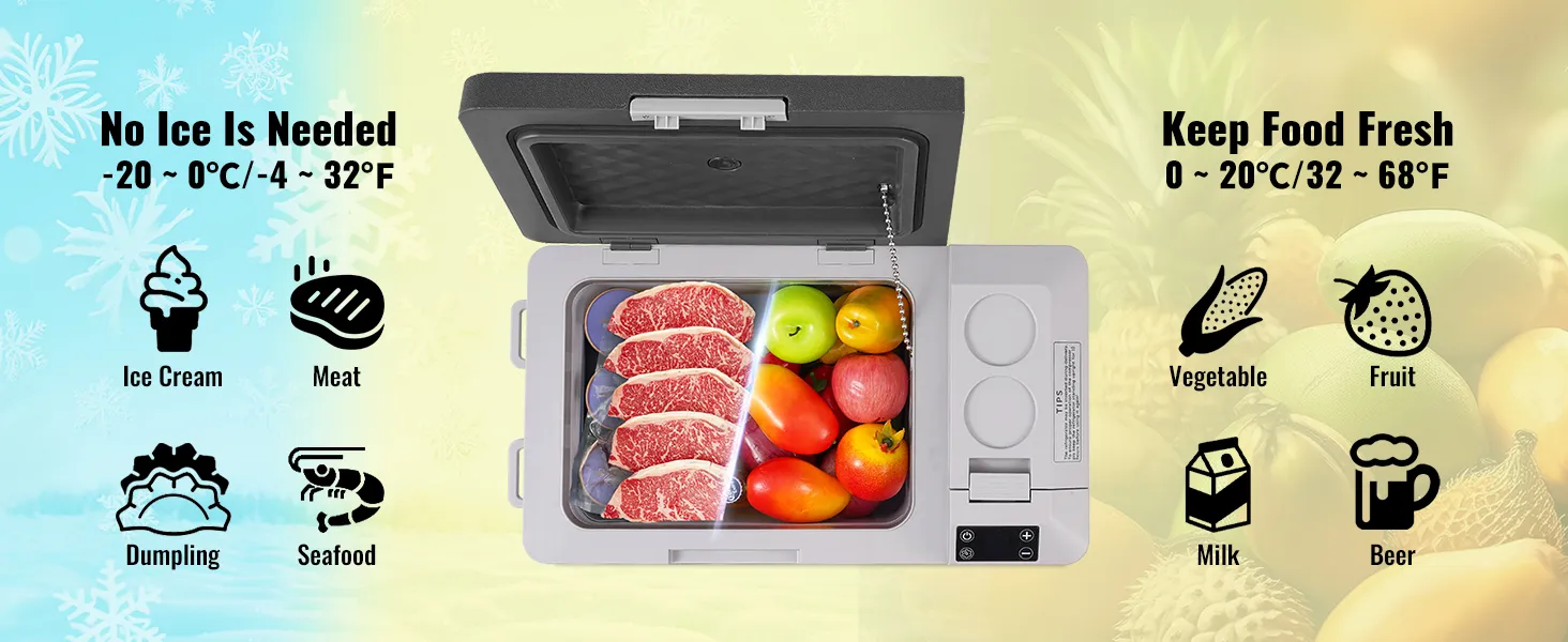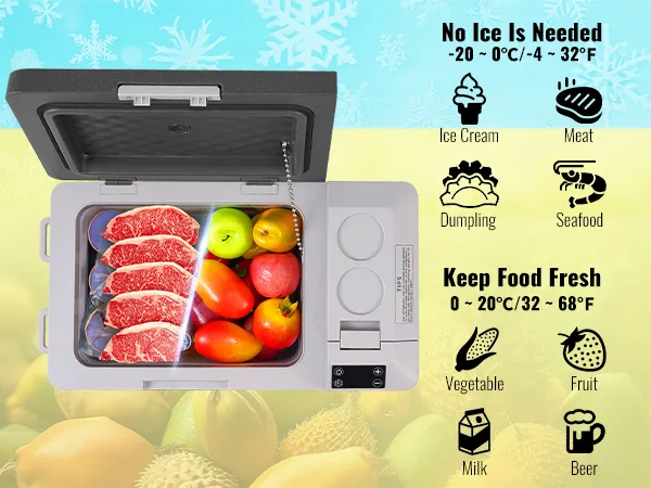 Adjustable temperature from -20 ~ 20 ℃ / -4 ~ 68 ℉, suitable for refrigerating beer, beverages, fruits, ice cream, various meats, and more.