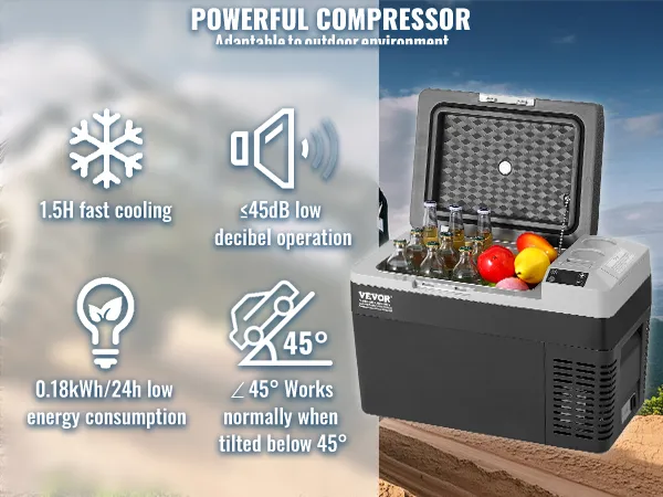 1.5H Rapid Cooling: This 12V car fridge uses compressor cooling technology, reaching -20°C / -4°F shutdown point in approximately 1.5H at 77°F ambient temperature. It cools quickly and operates normally even when tilted up to 45 degrees, making it your companion for outdoor camping or work, keeping your food fresh. No need for ice cubes, preventing food spoilage and saving money and space.