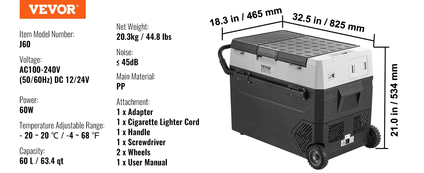 VEVOR draagbare autokoelkast, 12V autokoeler, 60L draagbare vriezer met één zone, oprolbaar, instelbaar -20 tot 20℃, compressorkoeler voor thuis, buiten, kamperen, camper en auto