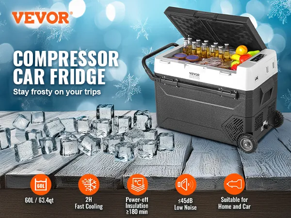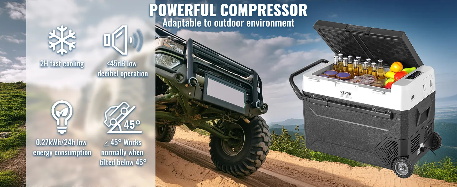 Autokoelkast van 60 liter met verbeterde compressor voor snelle koeling binnen 2 uur, kan zowel bij hoge als lage temperaturen worden bewaard, waardoor een optimale werking tussen 16 en 38°C wordt gegarandeerd.