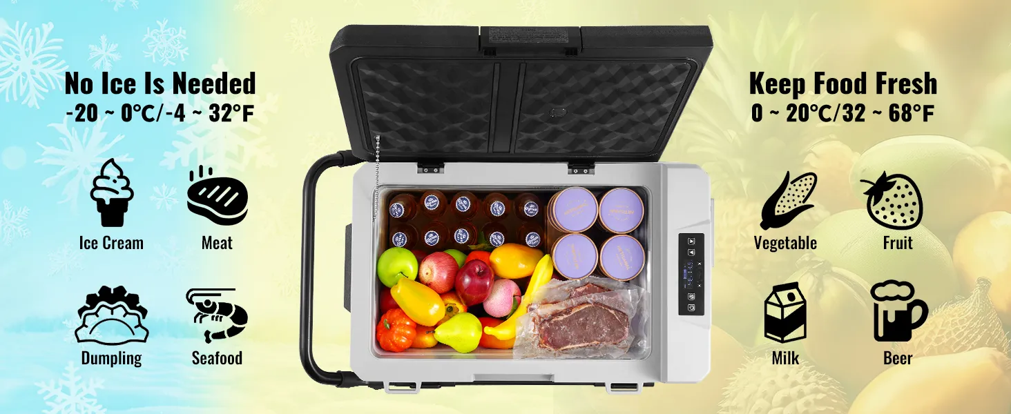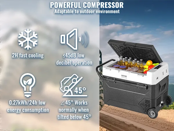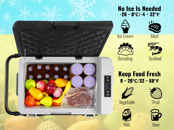 2 uur snelle koeling: deze 12-volt autokoelkast maakt gebruik van compressorkoeling en bereikt een uitschakelpunt van -4 °F (-20 °C) in ongeveer 2 uur bij een omgevingstemperatuur van 77 °F (25 °C). Hij koelt snel af en functioneert normaal, zelfs als hij tot 45 graden wordt gekanteld. Dit maakt hem tot een ideale metgezel tijdens het kamperen buiten of op het werk en houdt je eten vers. Je hebt geen ijsblokjes nodig, waardoor eten niet bederft en je geld en ruimte bespaart.