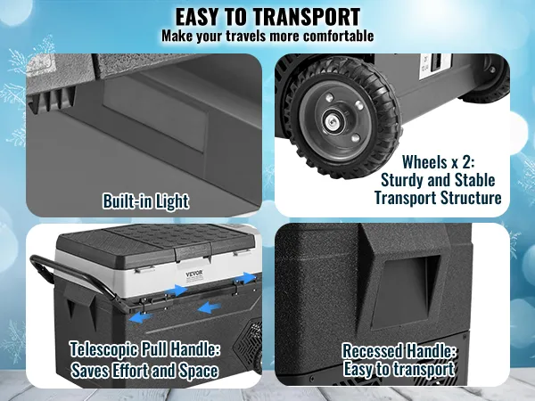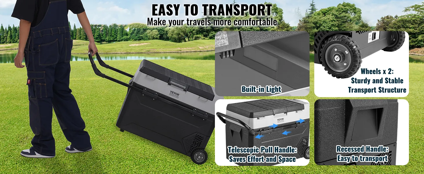 Twee wielen gecombineerd met een telescopisch handvat zorgen voor een stevige en stabiele transportstructuur die reizen moeiteloos maakt. Het geïntegreerde lichtontwerp verlicht de binnenkant wanneer deze wordt geopend, waardoor het selecteren van voedsel eenvoudiger wordt.