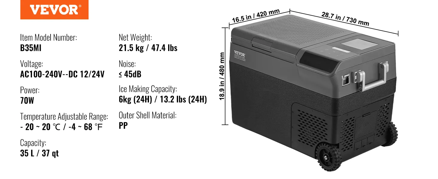 The 35 L car refrigerator features an upgraded compressor for rapid cooling in just 1.5 hours. It includes an ice-making function that produces 6 kg / 13.2 lbs of ice daily and performs well across a wide temperature range from 16 to 38°C / 60.8 to 100.4°F.