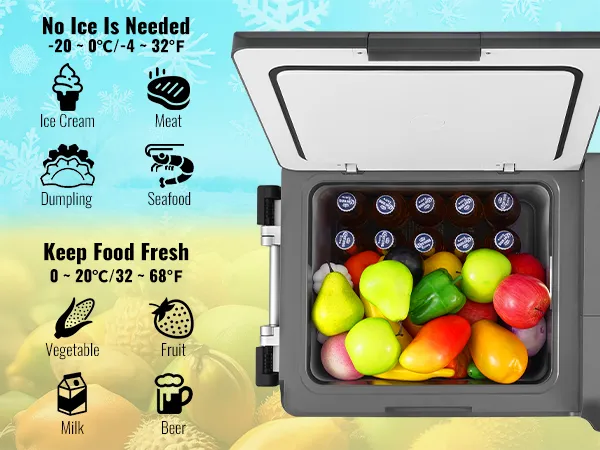 Adjustable temperature from -20 to 20°C / -4 to 68°F allows for the storage of beer, beverages, fruits, ice cream, various meats, and more, ensuring effective cooling and preservation.