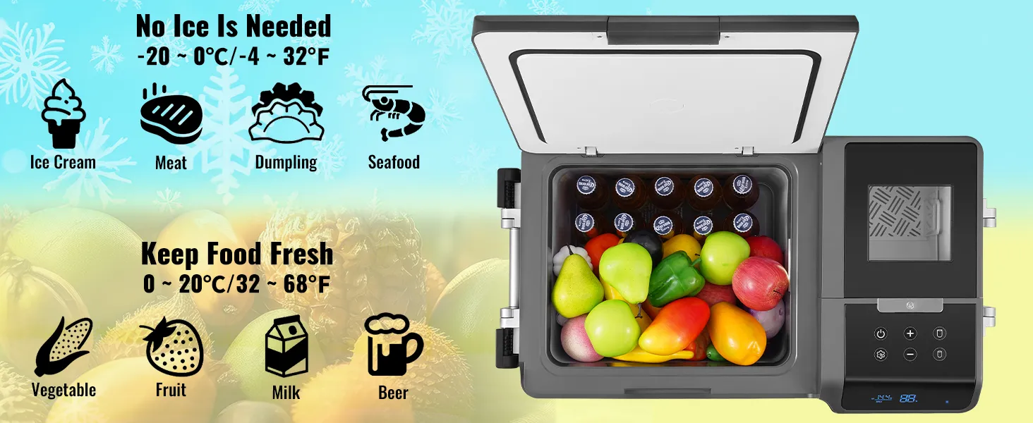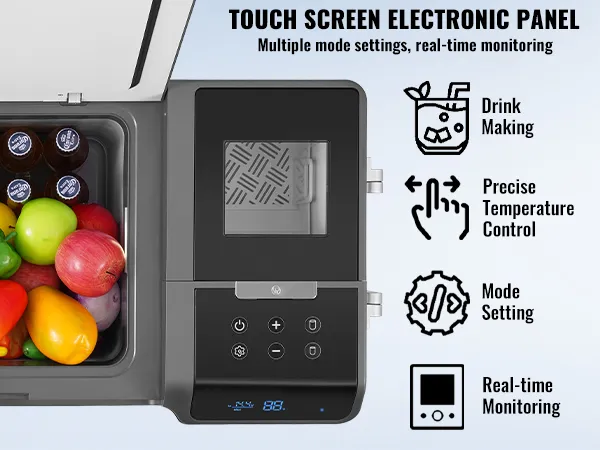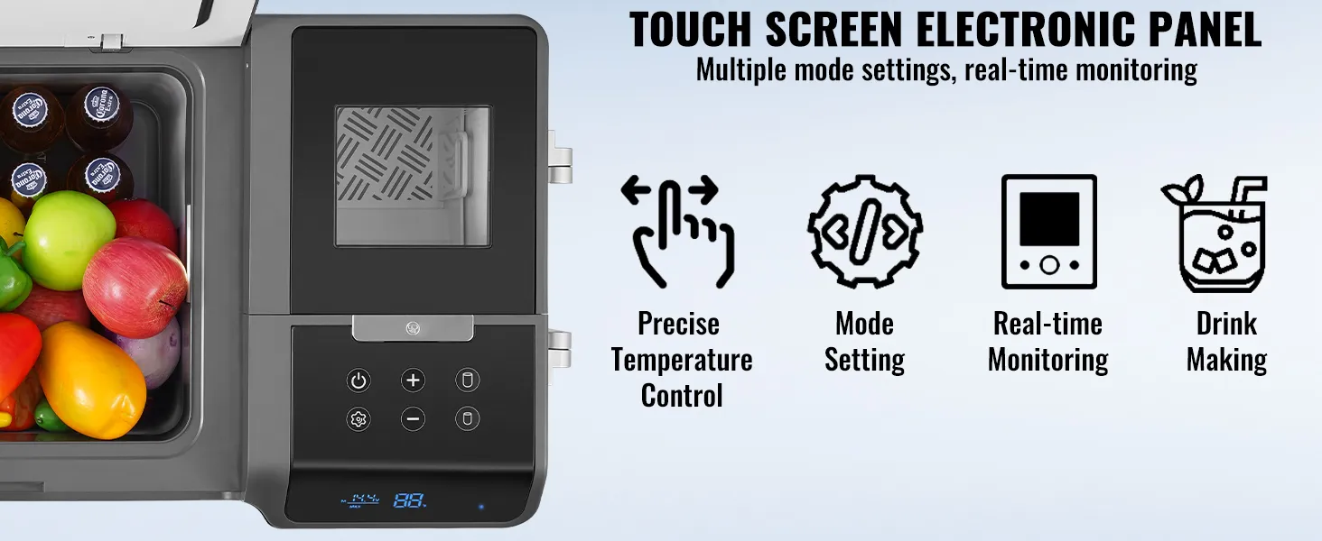 Ice-Making Function: Equipped with an ice-making feature, this car fridge can produce 6 kg / 13.2 lbs of ice per day, providing fresh ice wherever you go. The touch control panel allows you to monitor the fridge’s status and adjust the temperature range, with settings from -20 to 20°C / -4 to 68°F.