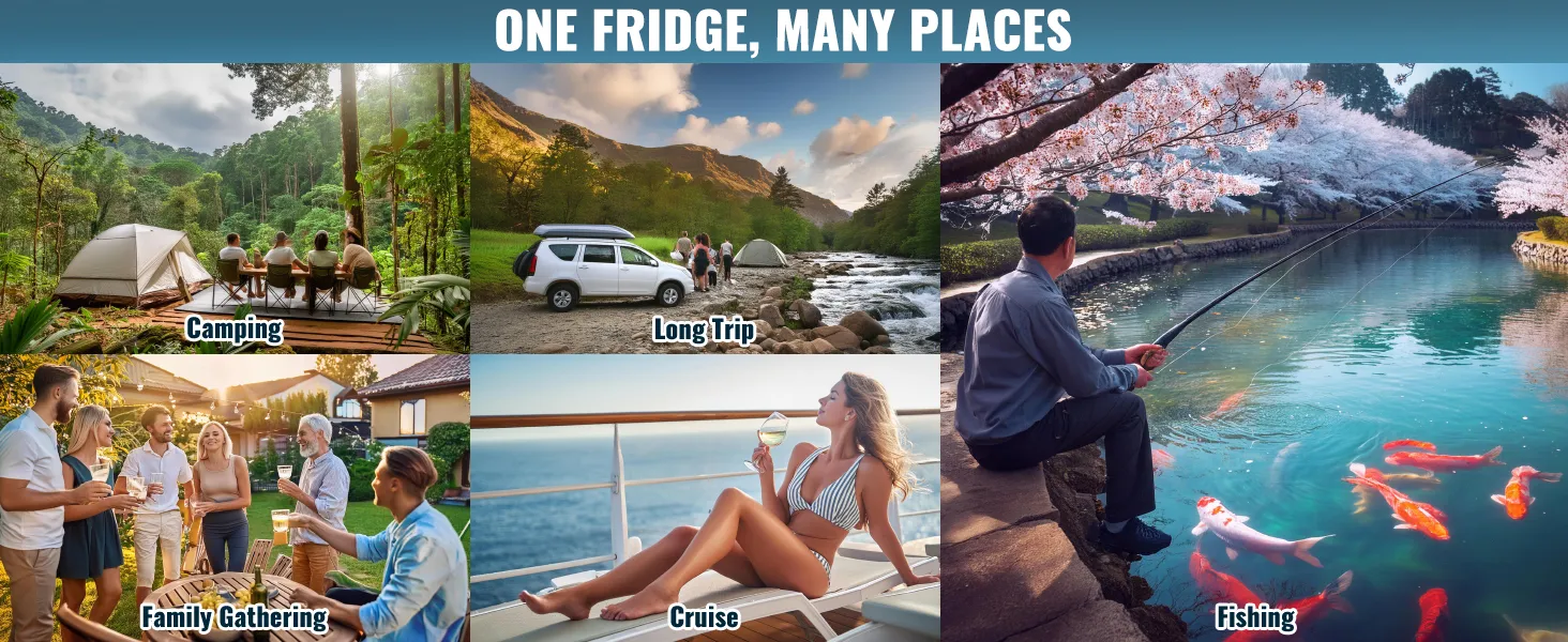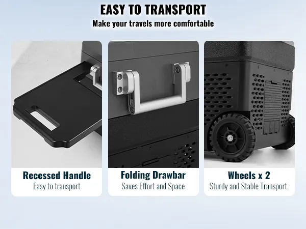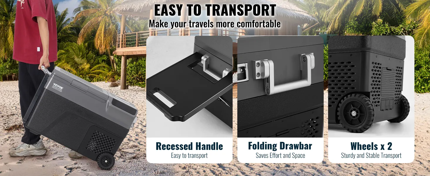 Home/Car Dual Use: Featuring sturdy wheels and a folding handle for easy transport, this car fridge is versatile. It includes both 110/240V AC and 12/24V DC adapters, making it suitable for use at home, on yachts, in RVs, cars, trucks, or vans.