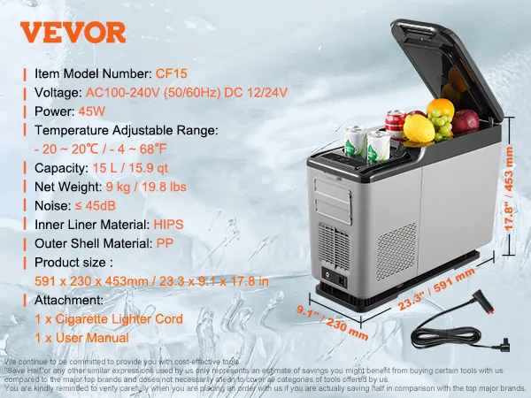 Grote inhoud: De koel-vriescombinatie met handgreep heeft één compartiment met een inhoud van 15 liter. Deze stevige camperkoelkast biedt plaats aan 20 blikjes cola (330 ml), 10 flessen water (550 ml) of 5 flessen rode wijn (750 ml), zeevruchten, snacks, vlees en drankjes en voldoet aan de behoeften van korte reizen zoals reizen, varen en kamperen.