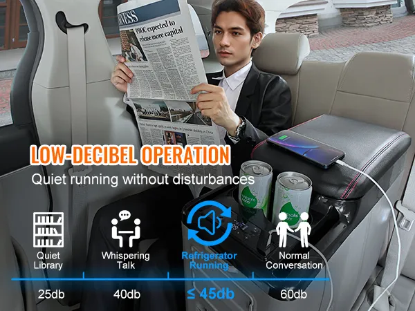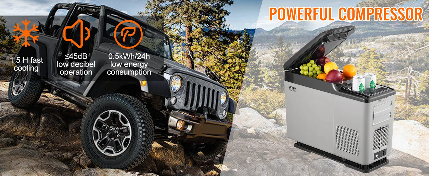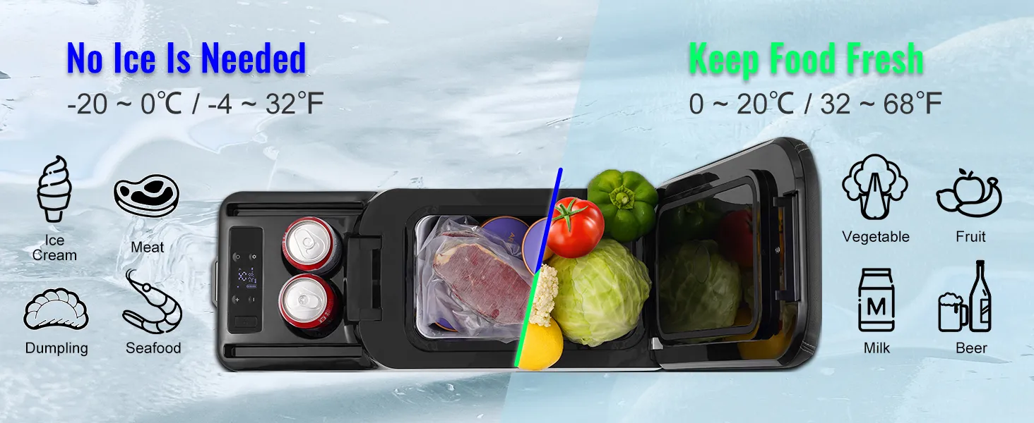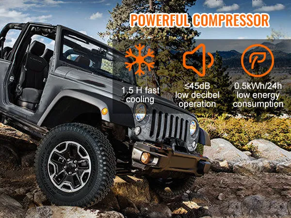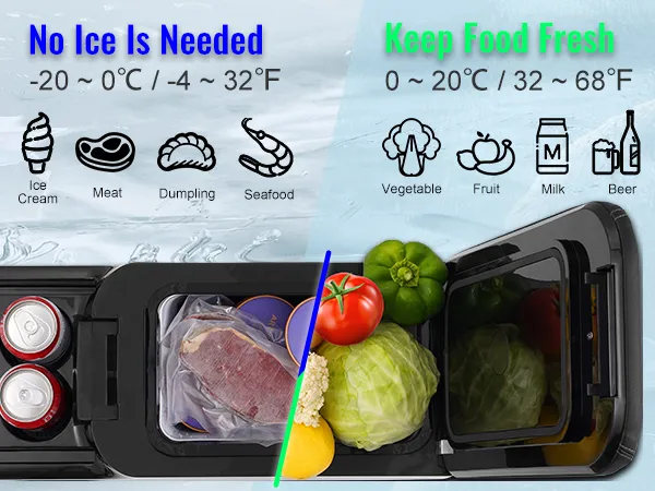 1,5 uur snelle koeling: De koelkast maakt gebruik van compressorkoeling en bereikt een temperatuur van -4 °F (-20 °C) in ongeveer 1,5 uur bij een omgevingstemperatuur van 77 °F (25 °C). Hij koelt snel en werkt zelfs onder een hoek tot 45 graden. Dit maakt hem tot uw metgezel tijdens het kamperen buiten of op het werk en houdt uw eten vers. Je hebt geen ijsblokjes nodig, waardoor voedsel niet bederft en je geld en ruimte bespaart.