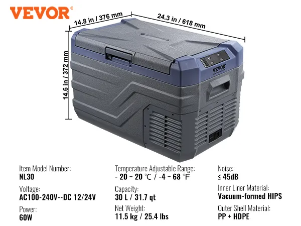 Large Capacity: The portable refrigerator freezer has a single compartment capacity of 30 L. This robust RV fridge can hold 40 cans of 330ml cola or 32 bottles of 550ml water or 7 bottles of 750ml red wine, accommodating seafood, snacks, meats, and beverages, meeting the needs of short trips such as travel, boating, and camping.
