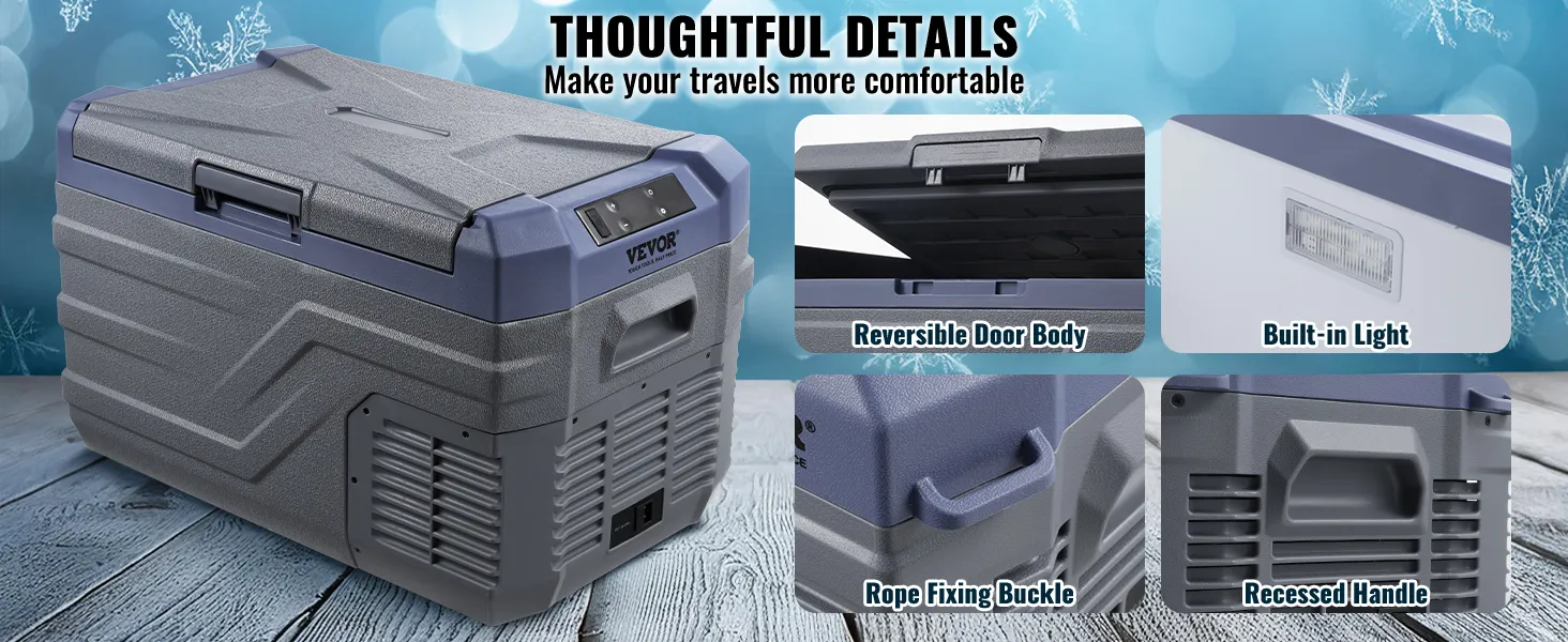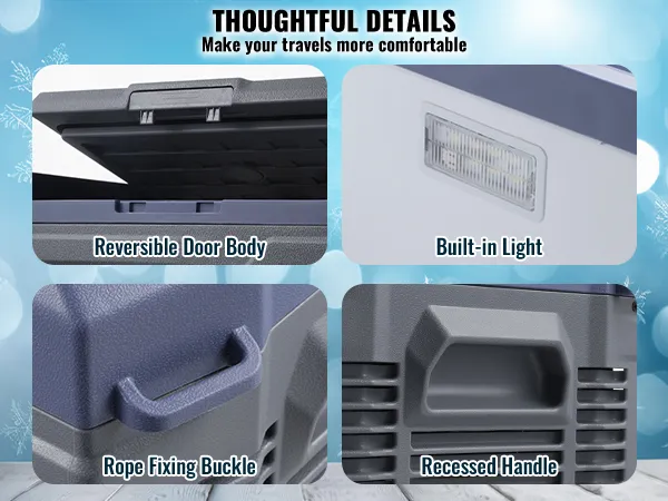 Dual Use for Home/Car: With a large capacity design, it features a built-in light that turns on automatically when the box is opened, making it convenient for you to access food. Additionally, the car fridge is equipped with 110/240V AC and 12/24V DC adapters, allowing it to be used at home, on yachts, RVs, cars, trucks, and vans.