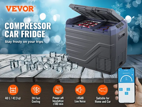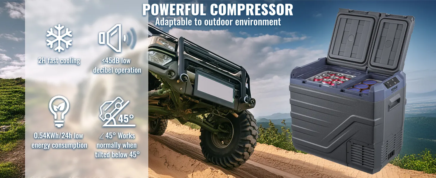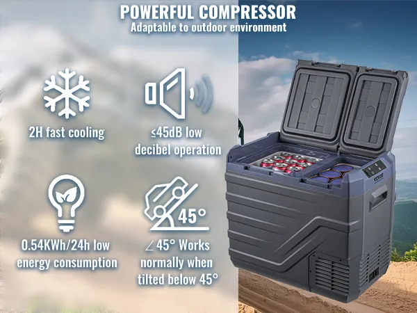 Snelle koeling in 1,5 uur: Deze 12 volt autokoelkast maakt gebruik van compressorkoeling en bereikt een vriespunt van -20 °C in ongeveer 1,5 uur bij een omgevingstemperatuur van 25 °C. Hij koelt snel af en werkt nog perfect, zelfs onder een hoek tot 45 graden. Dit maakt hem tot uw metgezel tijdens het kamperen buiten of op het werk en houdt uw eten vers. Je hebt geen ijsblokjes nodig, waardoor eten niet bederft en je geld en ruimte bespaart.