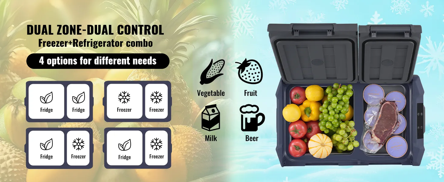 VEVOR Autokoelkast, 12V Autokoelkast, 40L Draagbare Tweezone Vriezer, Instelbaar bereik van -20°C tot 20°C, 12/24V DC en 100-240V AC, Compressorkoeler voor kamperen in de buitenlucht, camper