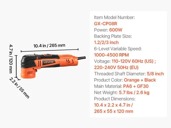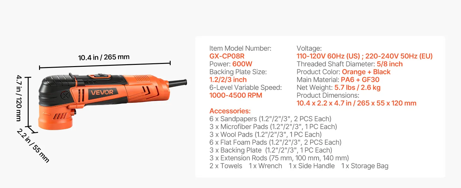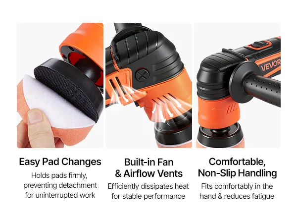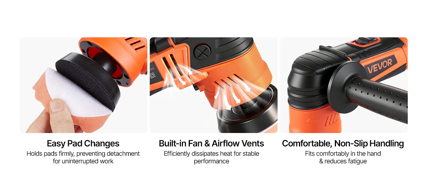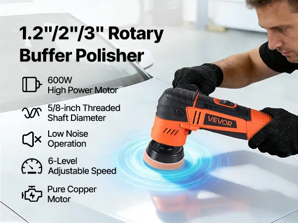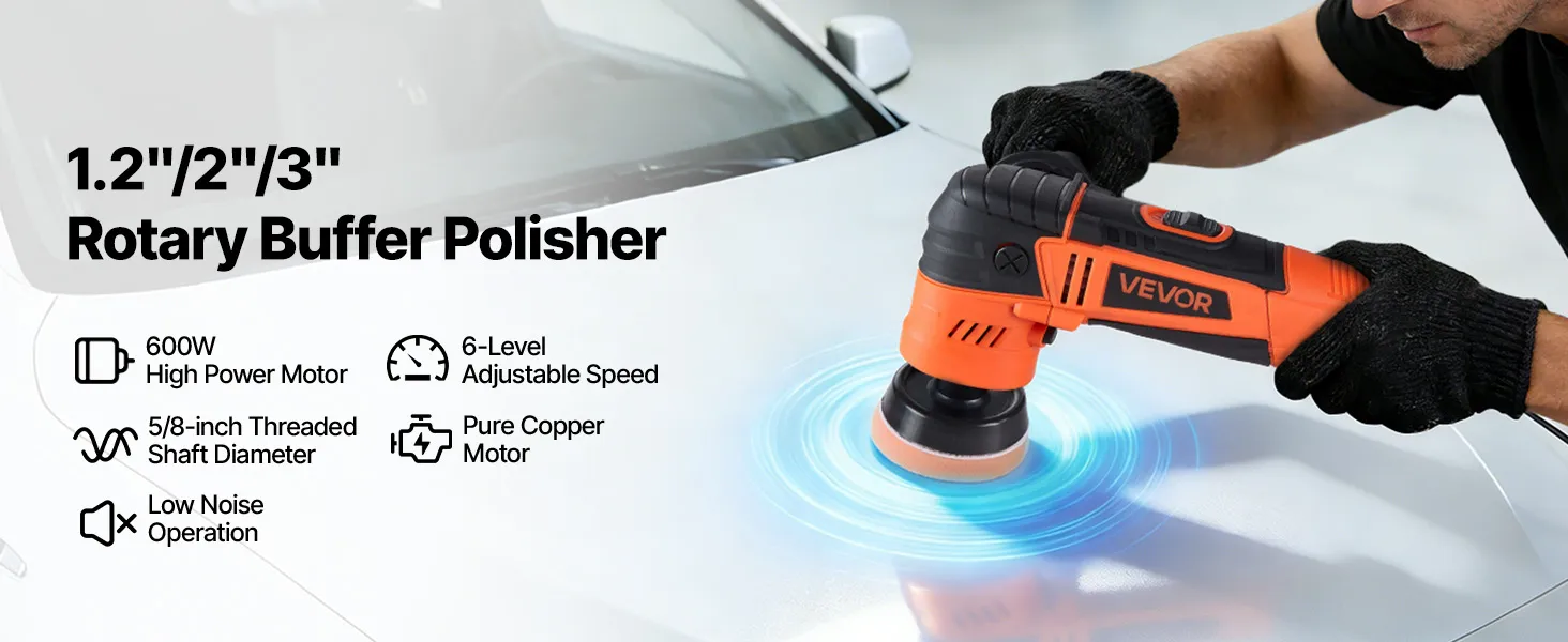 Met 3 steunplaten (30/50/76 mm), 6 instelbare snelheden en veelzijdige polijstpads herstelt deze VEVOR roterende polijstmachine de glans. Lichtgewicht en ergonomisch, biedt hij optimaal comfort en volledige controle.