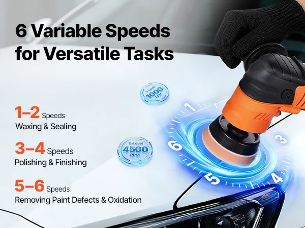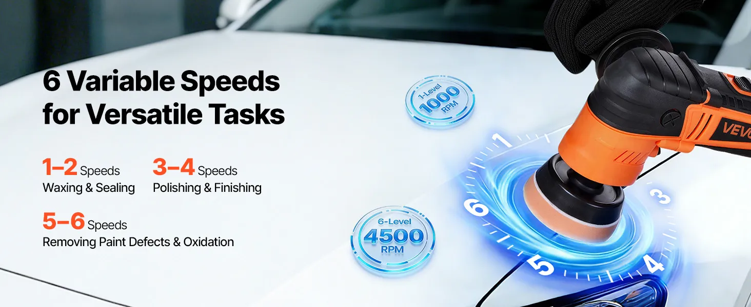 6 snelheidsinstellingen voor nauwkeurig polijsten: Met 6 instelbare snelheidsinstellingen (1000–4500 tpm) past deze autopolijstmachine zich aan elke klus aan – lage snelheden voor waxen en polijsten, gemiddelde snelheden voor polijsten en reinigen, en hoge snelheden voor het verwijderen van defecten en oxidatie.