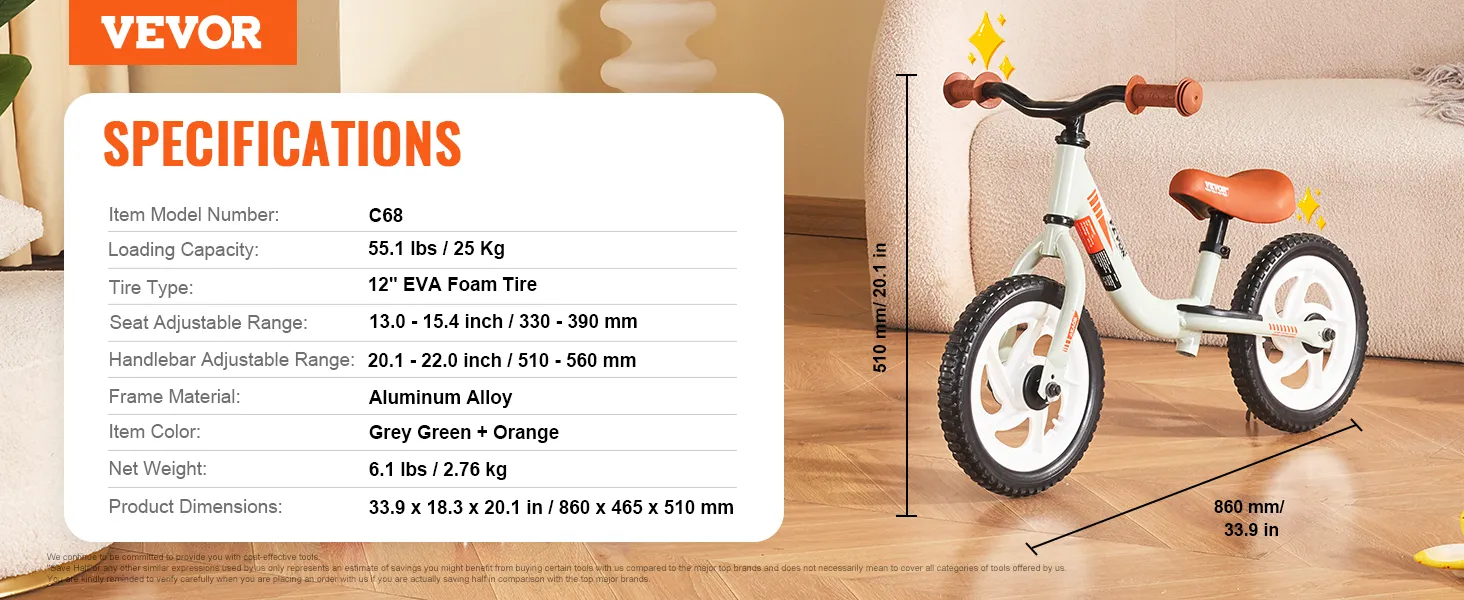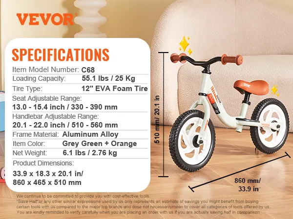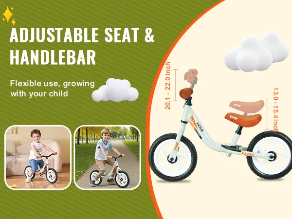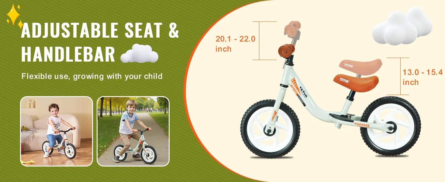 De VEVOR verstelbare peuterfiets heeft een verstelbare zitting en stuur. De zithoogte kan worden aangepast van 13,0 tot 15,4 inch. De verstelbare stuurhoogte is 20,1 tot 22,0 inch, zodat de fiets kan worden aangepast aan de groei van uw kind. Het blijft een geweldige fietspartner naarmate uw kind groeit. U kunt de hoogte eenvoudig aanpassen aan de behoeften van uw kind. Dit betekent dat het plezier niet hoeft te stoppen als uw baby groter wordt. Een verstelbaar ontwerp maakt het een ongelooflijk veelzijdige en duurzame keuze.