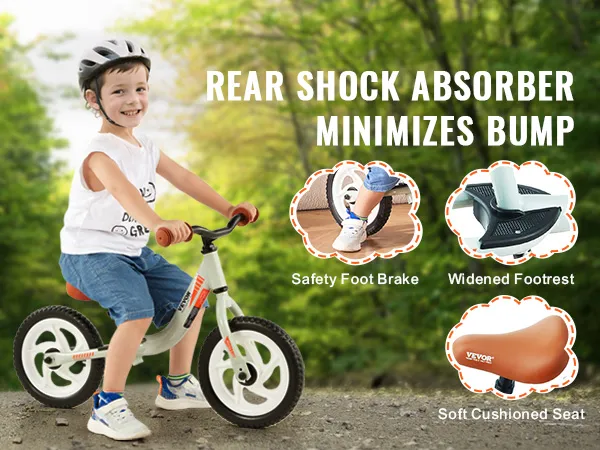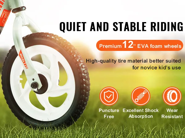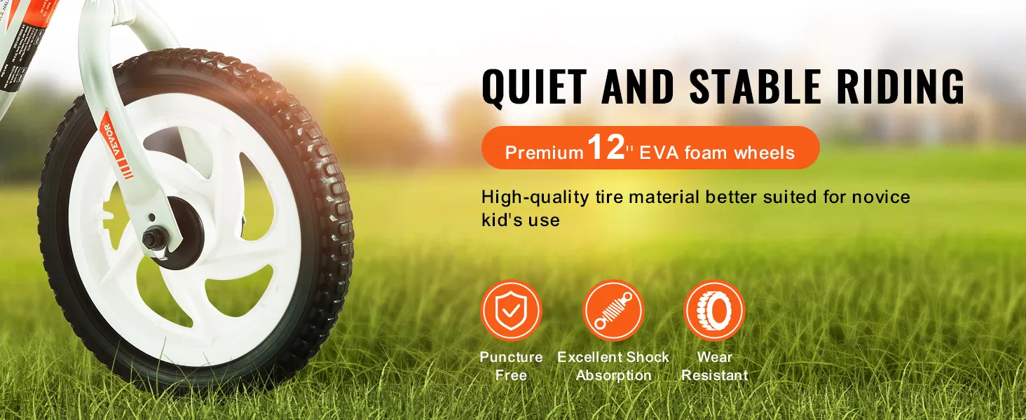 De VEVOR lichtgewicht kinderfiets heeft 12-inch EVA-schuimwielen. Deze wielen zorgen voor een soepele rit met geweldige schokabsorptie. Ze werken ook met weinig geluid, wat de rit aangenamer maakt. De wielen zijn slijtvast en lekvrij. Dit maakt ze ideaal voor verschillende oppervlakken zoals gras, trottoirs en binnenvloeren. Kinderen kunnen zelfverzekerd en comfortabel fietsen. De schuimwielen zorgen voor betrouwbare stabiliteit en stilte, zelfs op ruwe oppervlakken. Uw kind kan zich concentreren op het genieten van zijn of haar rit zonder afleidingen. Het draagt bij aan de algehele veiligheid en het plezier van de fiets.