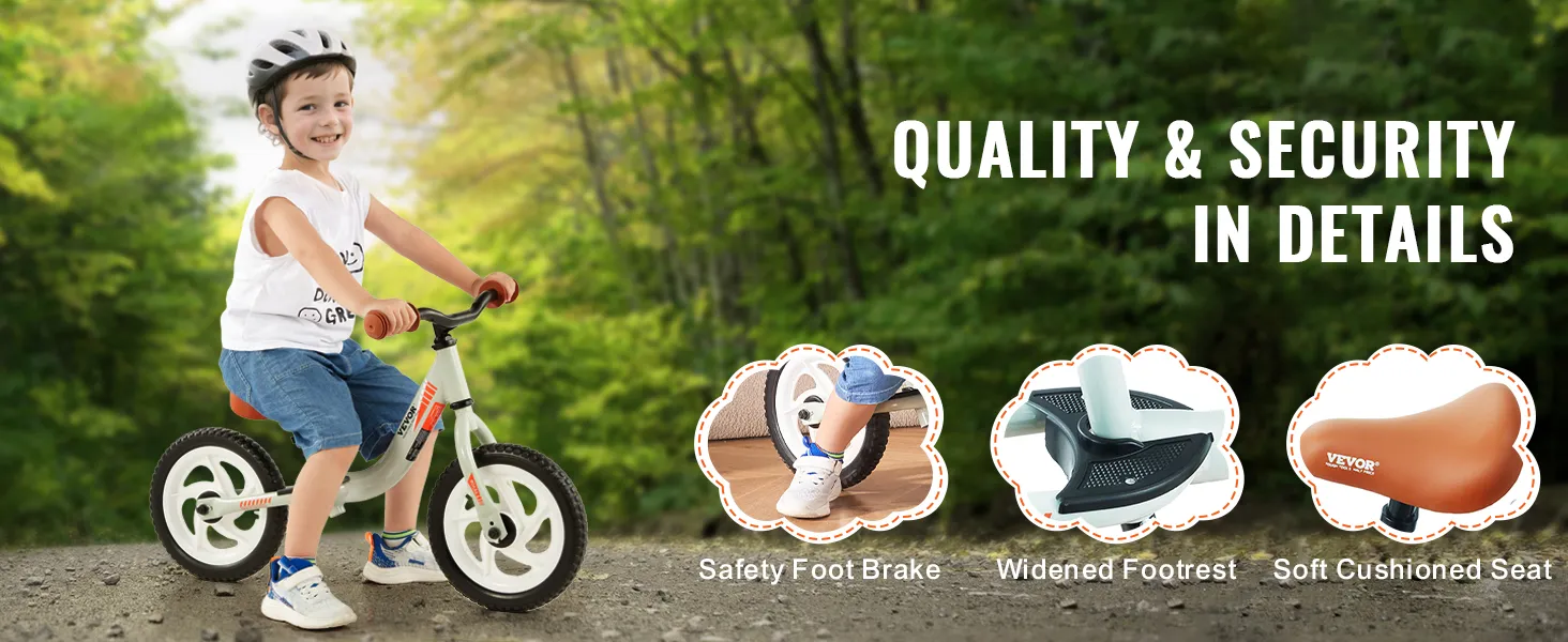 Veiligheid staat voorop bij de VEVOR 12-inch loopfiets. Kinderen kunnen gemakkelijk met hun voeten de grond raken. Dit maakt het gemakkelijk om de snelheid te regelen, te stoppen en te bewegen. Het is perfect voor beginners en kleine kinderen. De veilige voetrem, bredere voetsteun en een gevoerde zitting zorgen voor een veiligere, comfortabelere rit. Het ontwerp van onze fiets zorgt ervoor dat uw kind vol vertrouwen kan fietsen. U helpt op een efficiënte manier vaardigheden en onafhankelijkheid op te bouwen. Deze loopfiets biedt gemoedsrust voor ouders en een spannend avontuur voor kinderen.