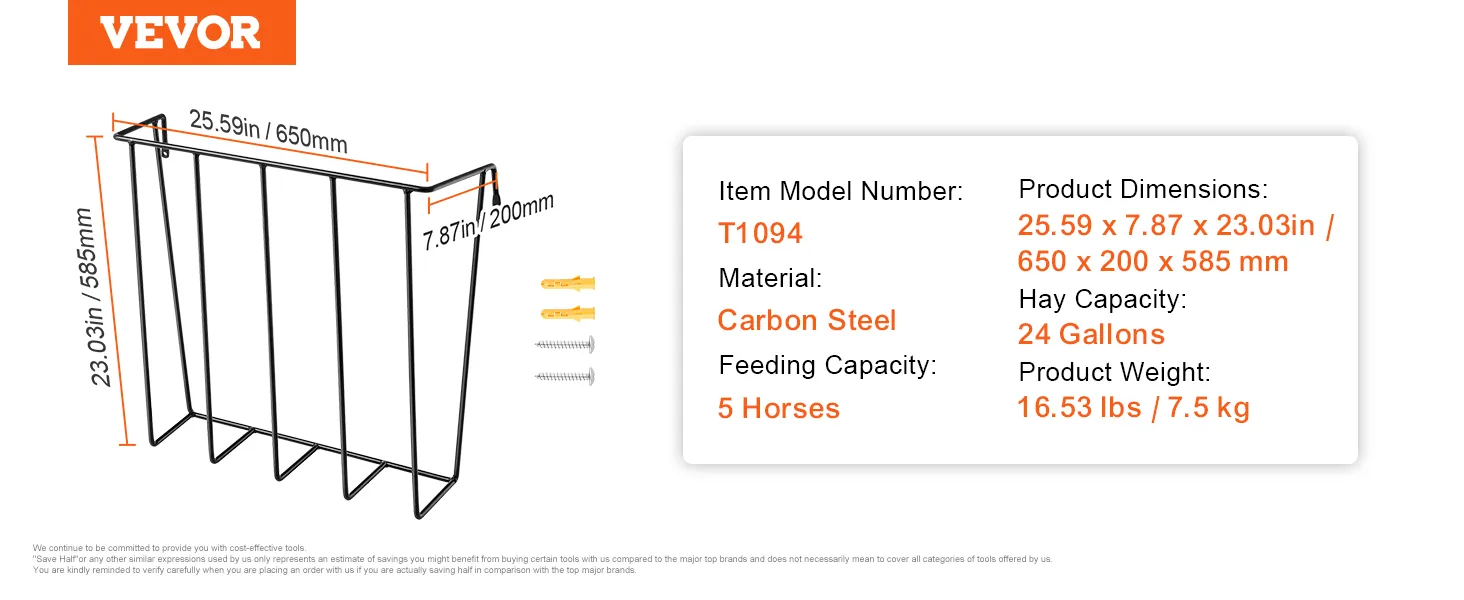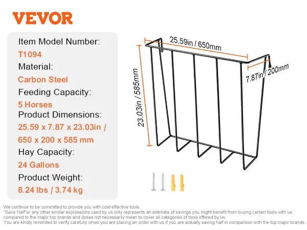 VEVOR hooiruif voor vee, grote capaciteit van 24 gallon, stalen voerruif, 27 inch lang, aan de muur te bevestigen paardenvoerbak, voerbak voor schapen voor binnen- en buitenveehouderijen, 650 x 200 x 585 mm