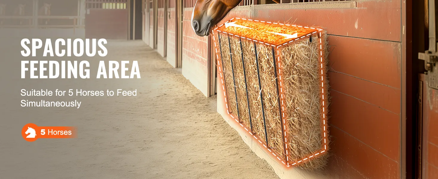 Deze aan de muur gemonteerde hooidispenser heeft een inhoud van 24 gallon, is gemaakt van duurzaam staal en heeft een afgerond ontwerp dat geschikt is voor het voeren van maximaal 5 paarden tegelijk en is eenvoudig te monteren op verschillende muren.